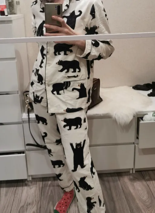 Очаровательнейший костюмчик ! Я влюбилась в него ещё во время заказа, точнее в этих медведей)) Получила через 2 недели после заказа и полюбила этих ребят ещё больше!)) Ткань очень приятная, похожа на натуральный хлопок , но такой .. пушистенький ( я не спец по тканям) На свой XS/S ( ОБ 91, ОТ 66, ОГ 83 ) взяла М , сидит свободно , как я планировала. Спасибо продавцу за сервис, за цену и за быструю доставку ;-*