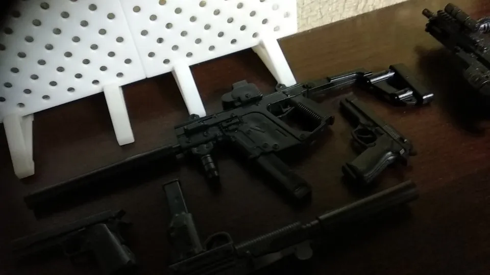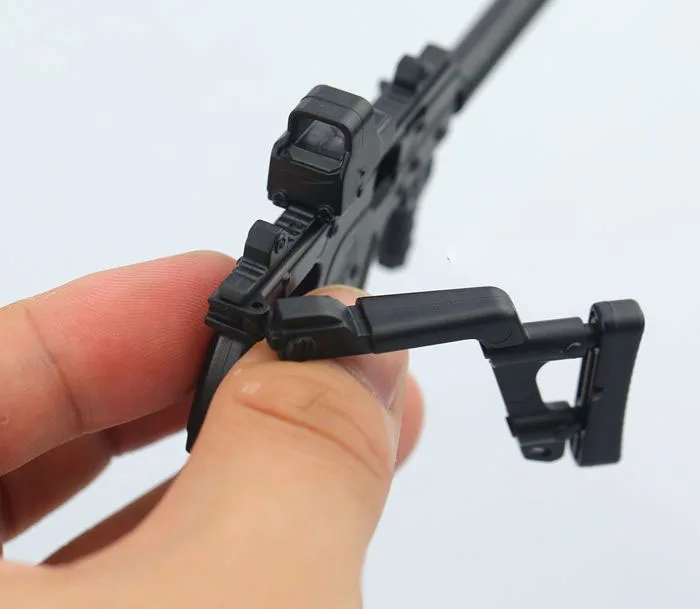 Очень порадовало наличие стойки в комплекте. В целом моделька неплохая. Положительные моменты: Складной приклад, съёмный глушитель, отъемный магазин, окошко экстрактора сквозное в шахту магазина. Минусы: приклад не фиксируется в сложенном положении, имитация ris планок(обвесы с других моделек не встанут). Извиняйте за качество фото. но мне лень красить, а без покраски там фоткать нечего.