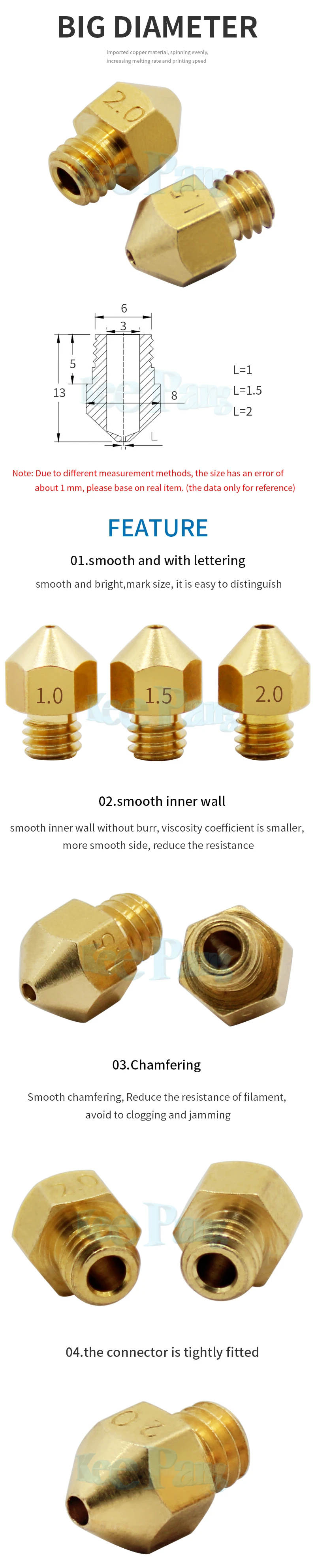 M6 медное сопло 1,0 мм 1,5 мм 2,0 мм сопла большего диаметра для 1,75 мм 3 мм нити большое отверстие Латунное сопло 3D принтер запчасти