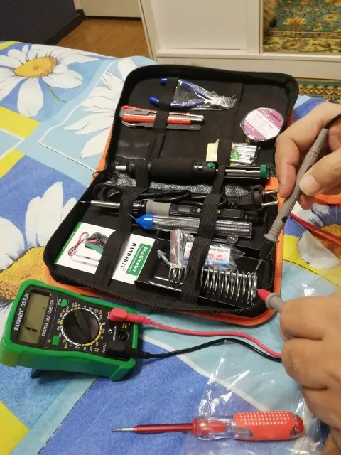 Доставка из России очень быстрая. Все соответствует описанию. Мультиметр работает (требуется установить две батарейки типа ААА). Паяльник не проверял, но выглядит как качественное изделие.