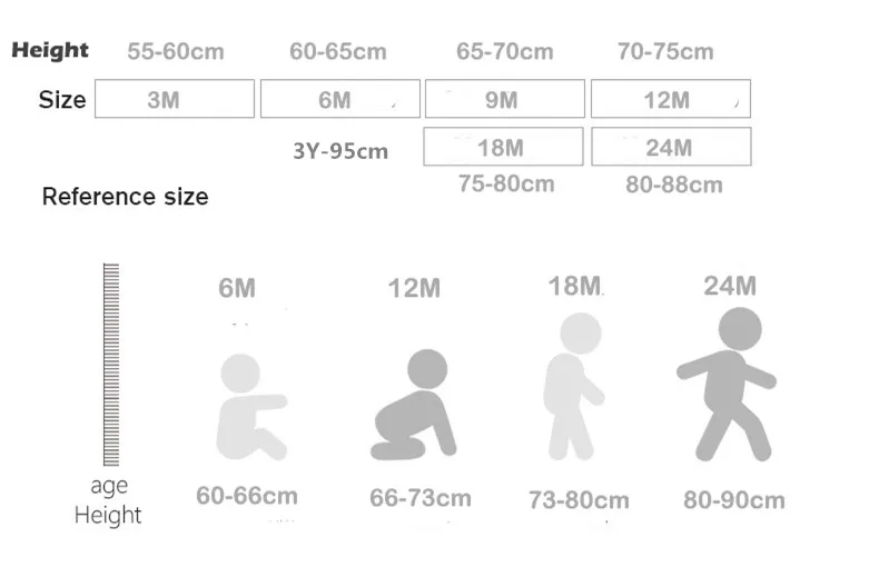 Таблица размеров Размер: 12 м/73 Длина: 31 см бюст: 24*2 см рукав: 8 см Длина брюк: 35 см Высота: 66-73 см Размер: 18 м/80 Длина: 33 см бюст: 25,5*2 см рукав: 8,5 см Длина брюк: 37 см Высота: 73-80 см Размер: 24 м/90 Длина: 36 см бюст: 26*2 см рукав: 9 см Длина брюк: 39 см Высота: 80-90 см Размер: 3Т/100 Длина: 39 см Обхват груди: 27,5*2 см рукав: 9,5 см Длина брюк: 41 см Высота: 90-100 см Примечание: 1. Возможны отклонения в размере на 1-3 см. 2. Уважаемый клиент, нельзя выбрать размер в соответствии с вашей привычкой и умом 3. Дети одного возраста могут иметь разный вес и рост.