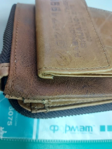 Бумажник хорошый. Швы ровные, запаха нет. Не кожа, конечно, но никто и не сомневался. Выглядит модняво и солидно.