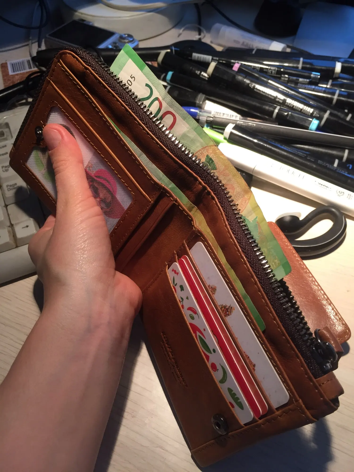 Брав з коробкою на самий дорощий на подарунок. Пляма клею мене засмутила. Невже постійному покупцеві з коробкою неможна було поставити бездоганний гаманець? По розмірам ні під "S" ні під "M" не підходить. По купюрам: €200, 500 грн заходить з запасом. Карточки не міряв