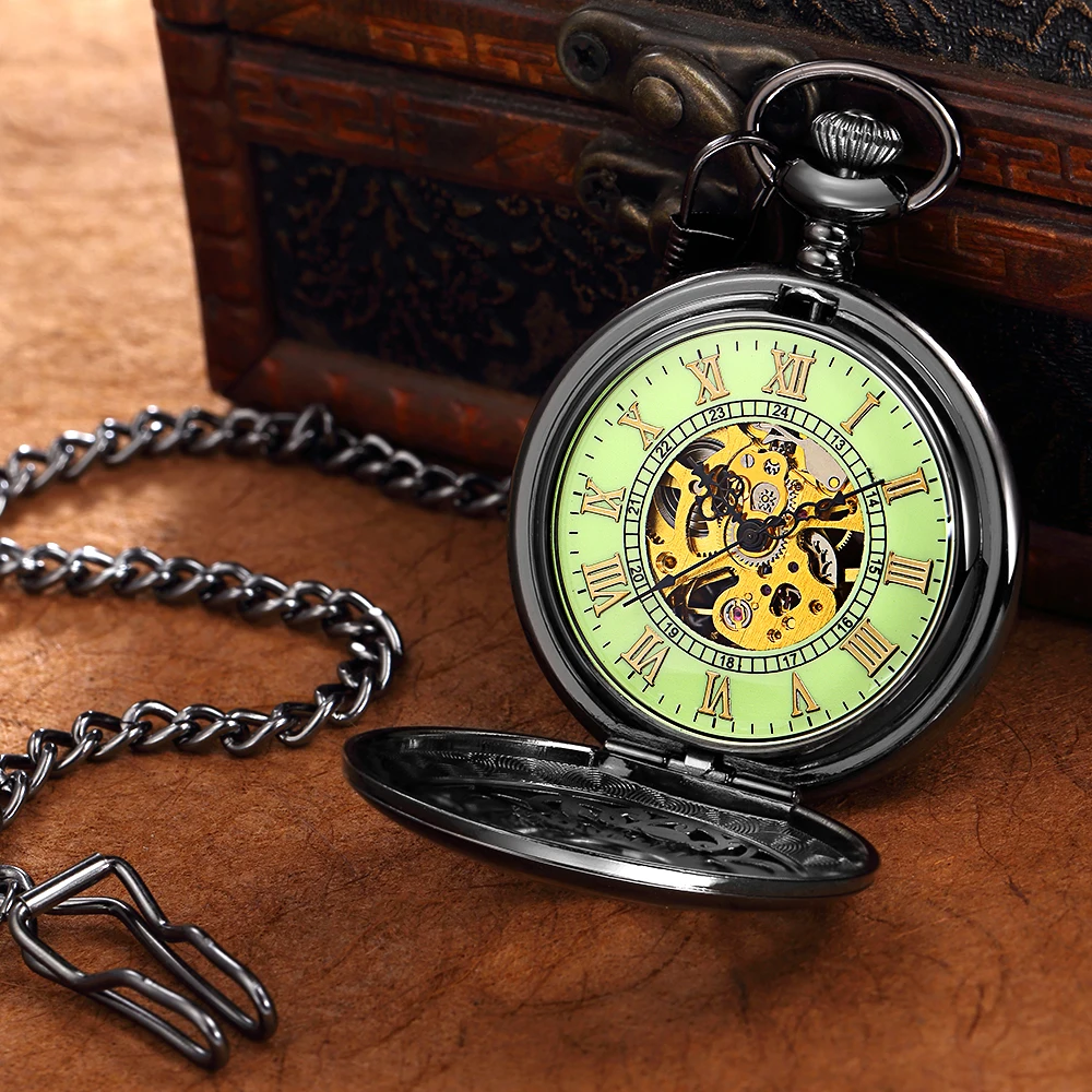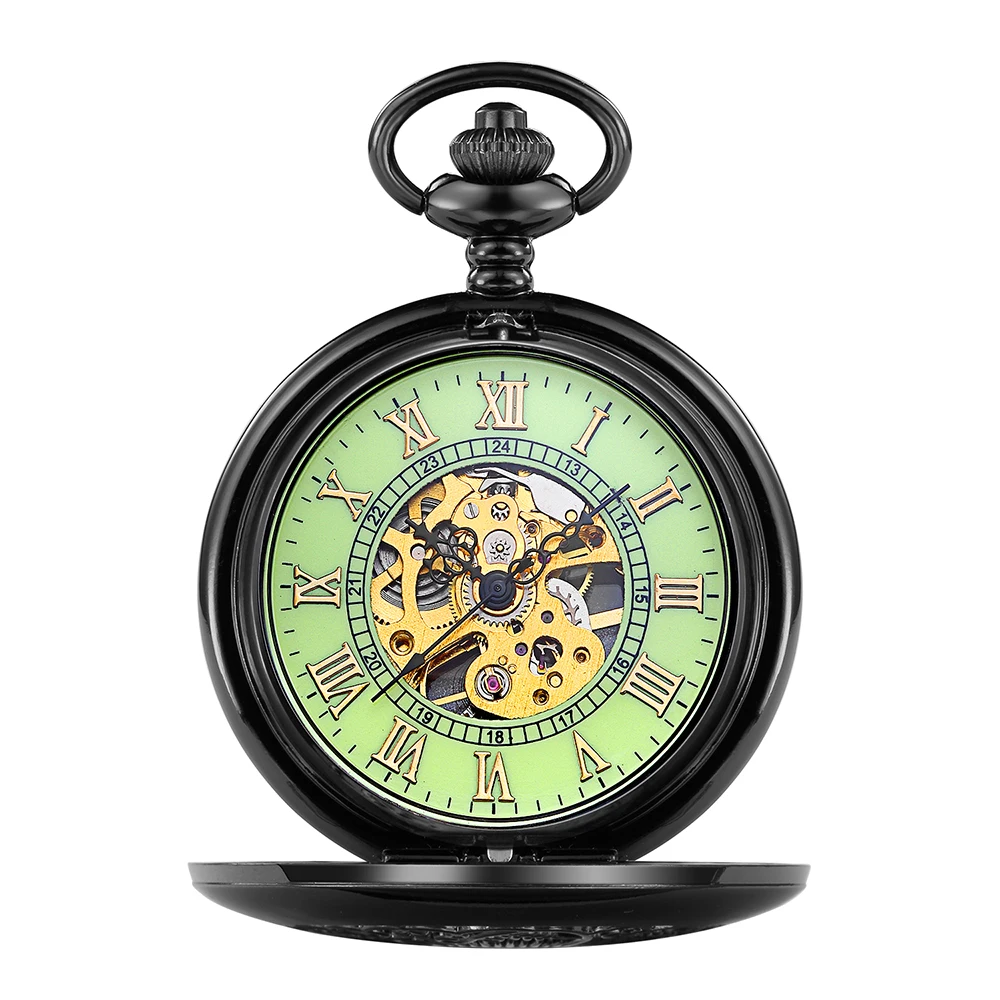 Карманные часы ORKINA, светящиеся, под старину, для мужчин и женщин, с черным чехлом, механические часы-скелетоны крышка с гравировкой с ночным светильник щением