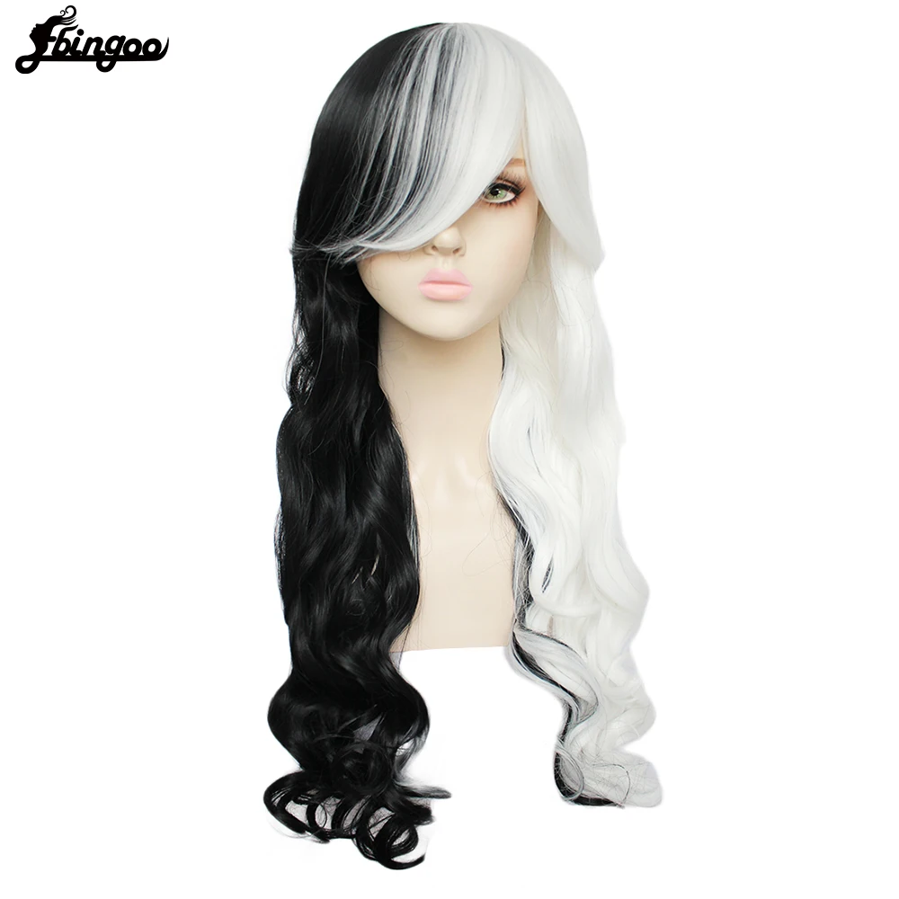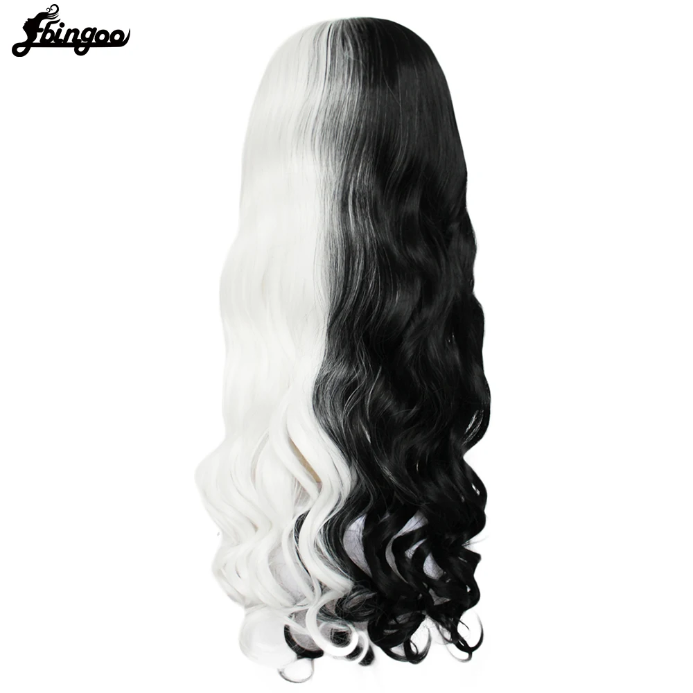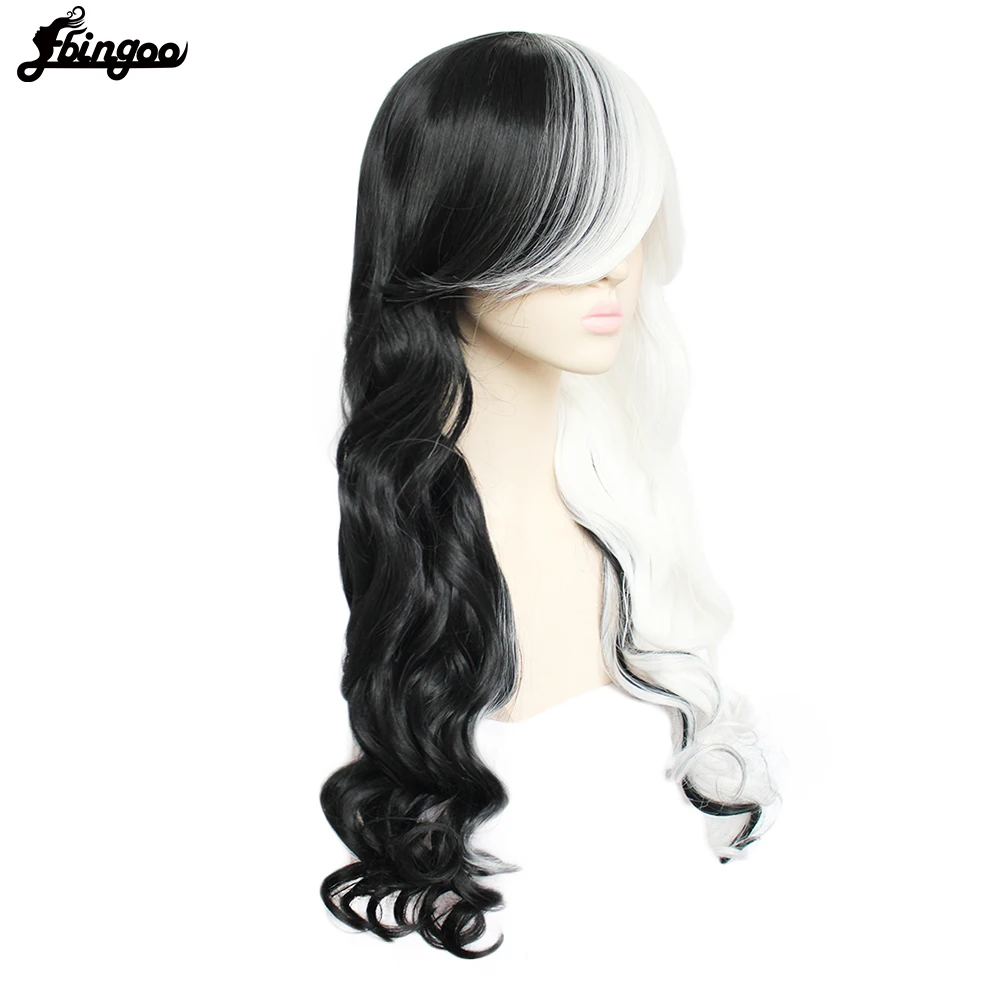 Парик для косплея Ebingoo Cruella Deville Side, наполовину белые и черные Многослойные натуральные волнистые синтетические волосы, парики Вечерние