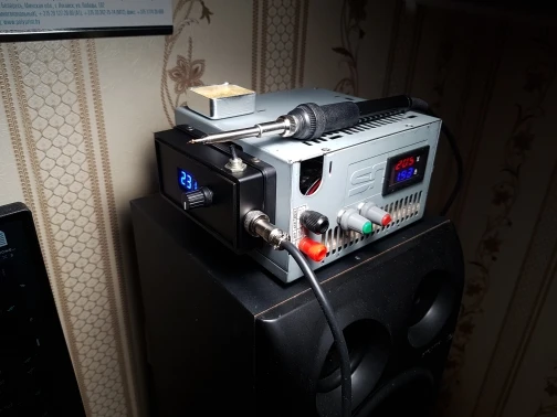 Отличный паяльник, запихал в коробку от какого то сгоревшего преобразователя, туда же поместился блок питания от нетбука, правда корпус бп пришлось разломать, все работает отлично, монтируется элементарно, единственный минус - родное жало, вот не нравится оно мне и все, другое куплю. Так же добавил на заднюю стенку разъем 5,5 х 2,1, что бы можно было в машине, например, запитать.