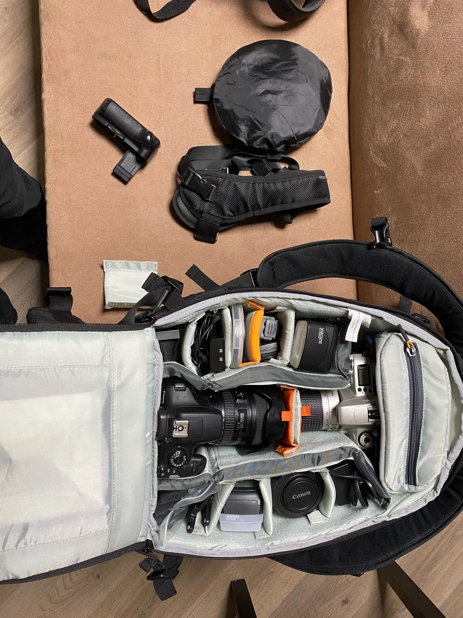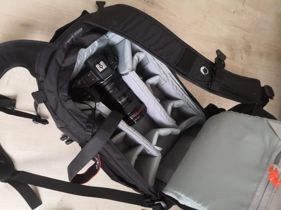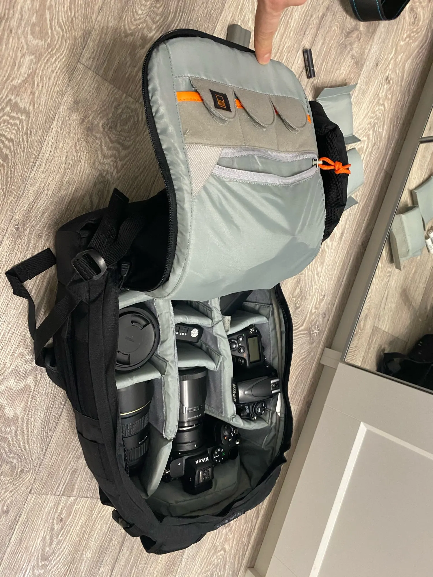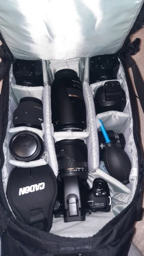 Неплохой рюкзак, но есть некоторые неудобные места, крышка открывается не полностью и не откидывается, приходиться держать что бы не закрывалась, поясная поддержка не снимается и если ее не застёгивать, то упирается в спину, в основной отдел в принципе влезло все( три объектива, две камеры, две вспышки и синхронизатор)так же в передний раздел запихнул разгрузку для камеры, маленькие разделы не очень, мне не хватило кармашков, что бы распихать все мелочи типа батареек, флешек и тп. по качеству вроде норм, есть мелочи типа торчащих ниток, но это мелочи.