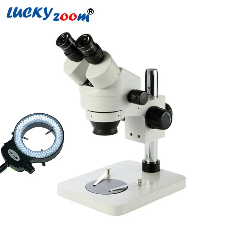 Lucky Zoom Brand 7X-45X Table Pillar Stand Zoom Magnification Binocular Stereo Microscope Inspect PCB Microscope+144 led Ring