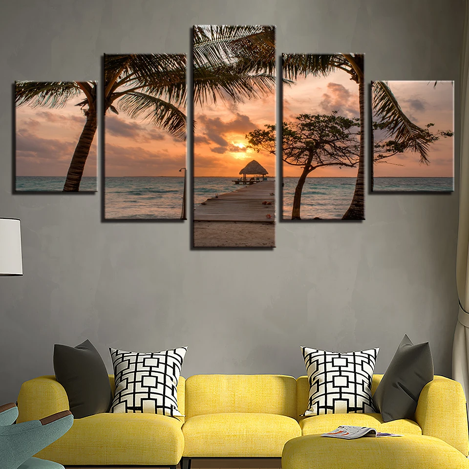 Модульная Картина на холсте, настенный постер с деревянным мостом, 5 панелей, картина с закатом, для украшения дома, морская рама для детской комнаты
