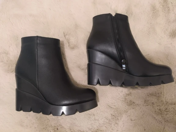 Вобщем долго смотрела я на эти ботильоны, и решилась их заказать. Доставка примерно месяц. Выглядят красиво. На этом собственно достоинства и заканчиваются. Платформа не имеет никакой амортизации, ходить в них можно только по ровному асфальту. Если есть камешки в асфальте, то это ад. Слишком высокий переход, когда одеваешь такое ощущение, что ногу свело. И самое главное размер, я заказала на размер больше 38, при том что у меня неполный 37 (для примера обувь ТМ Тофа 37 размера мне великовата), так вот они оказались мне впритык. Нога у меня узка, поэтому у кого широкая ступня однозначно будут малы. Вообщем не рекомендую к покупке, лучше пойти в магазин и купить обувь там. Жаль выброшенных денег. Для сравнения, на втором фото сапог от ТМ Тофа. Видите разницу.