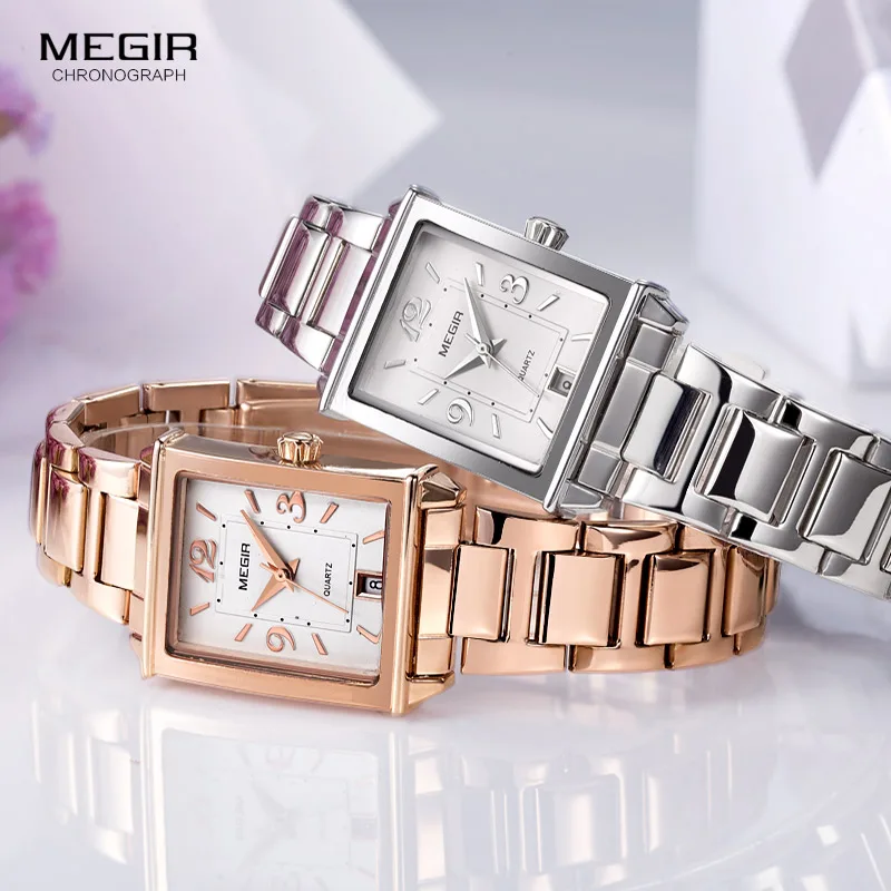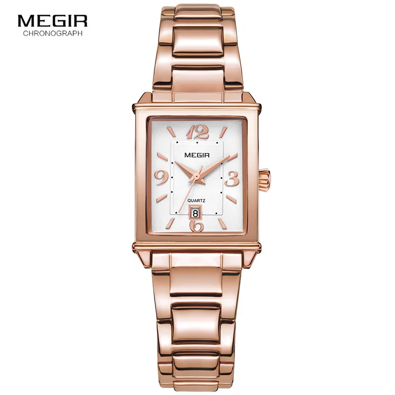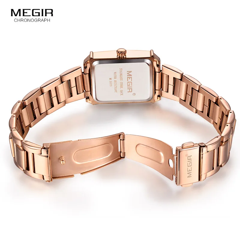 Женские кварцевые часы Megir, браслет из нержавеющей стали с аналоговым дисплеем, роскошные простые наручные часы цвета розового золота для женщин