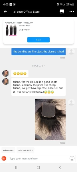 Awesome purchase! The seller stayed in contact with me, even contacted me when I got the hair installed. I love the hair! I recommended two of my friends to buy from the same seller. My friends loved my hair