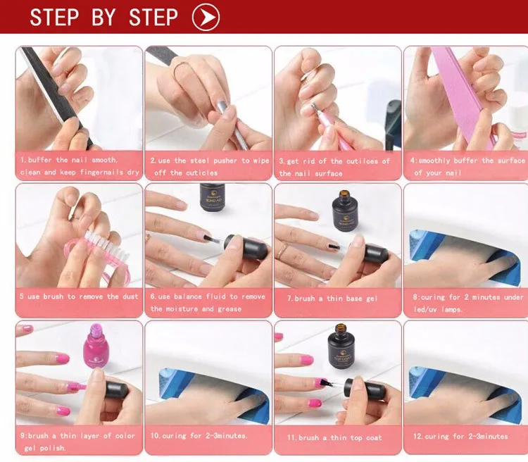 Шаг 1. Формирует ногти и очищает их Шаг 2. Почистите базовый слой и высушите их (УФ или Светодиодная лампа доступна) Шаг 3. Кисть fengshangmei гель для ногтей и лечение их(УФ или Светодиодная лампа доступны) Шаг 4. Почистите верхнее пальто и высушите их(УФ или Светодиодная лампа доступны)Для того, чтобы удалить: