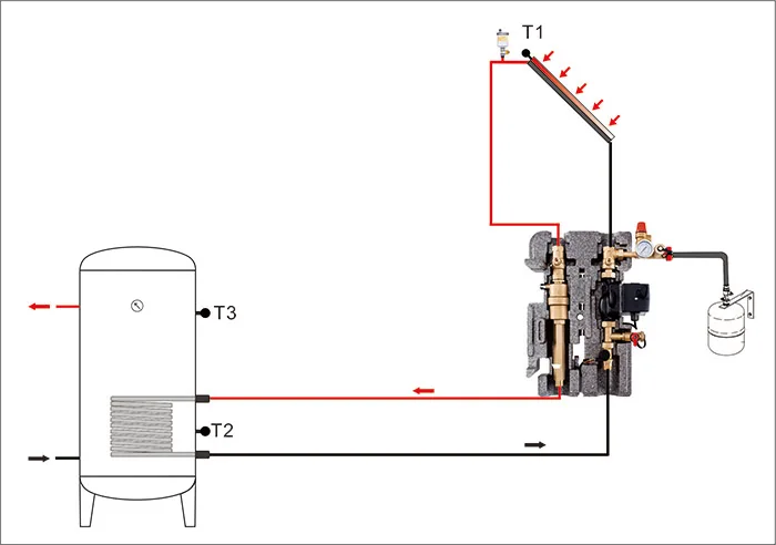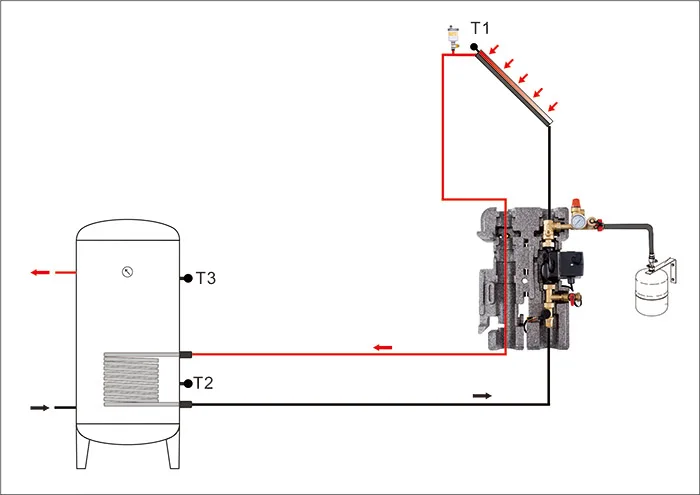 Группа фитингов должна быть установлена с достаточным интервалом для коллекторов, потому что температура в районе коллекторов может быть очень высокой. Для установки на чердаке может потребоваться промежуточное судно.
