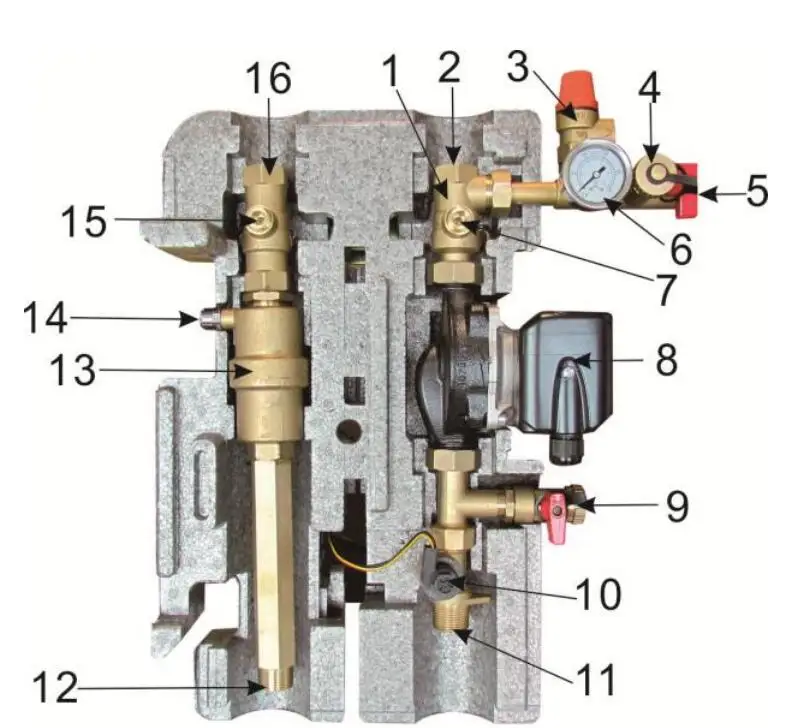 15) Датчик потока трубы (от коллектора до бака),NTC10K (опционально) (без датчика на станции SR11L) 16) разъем впускного потока (от коллектора):3/4 'IT