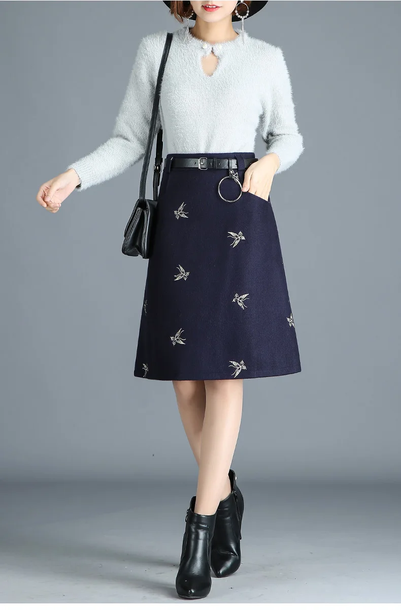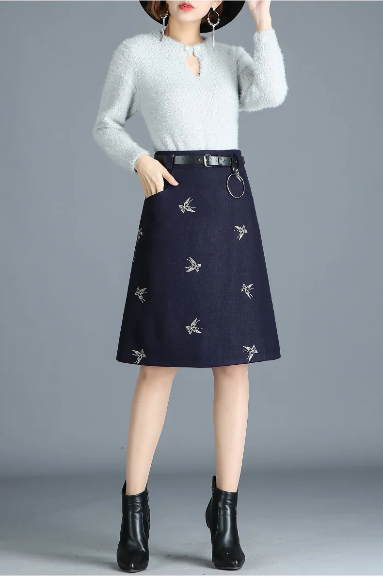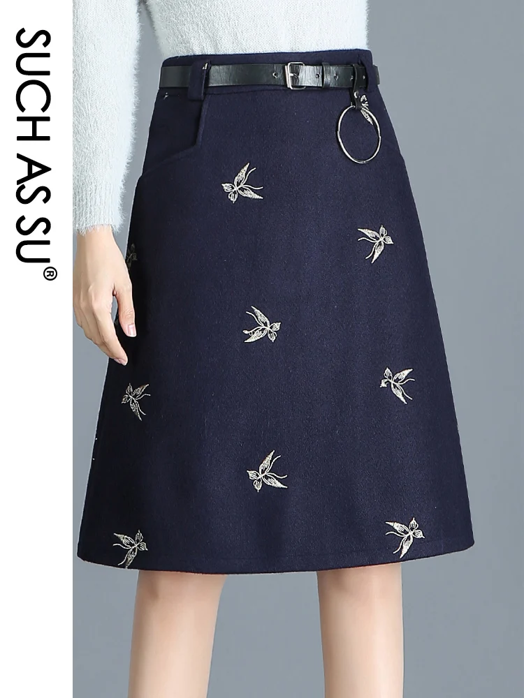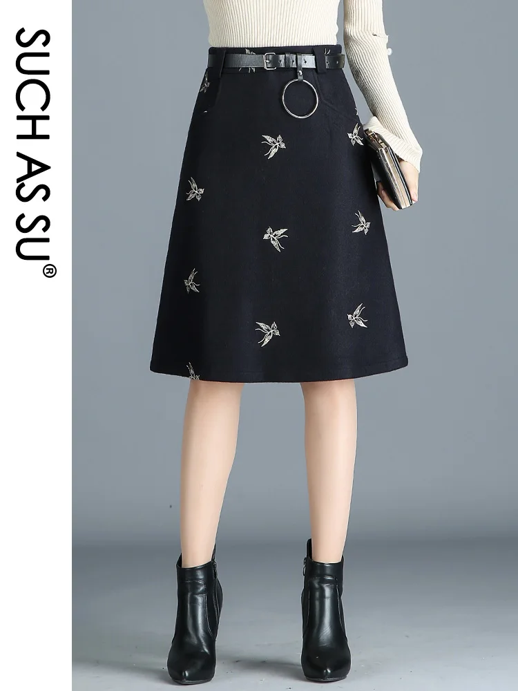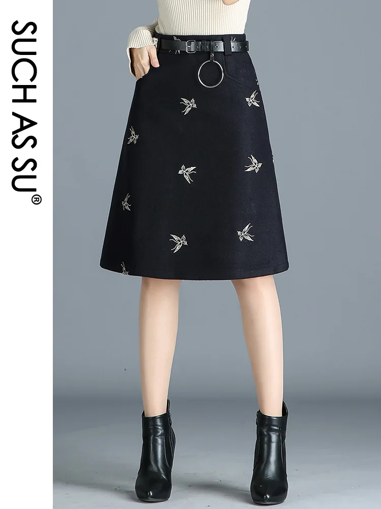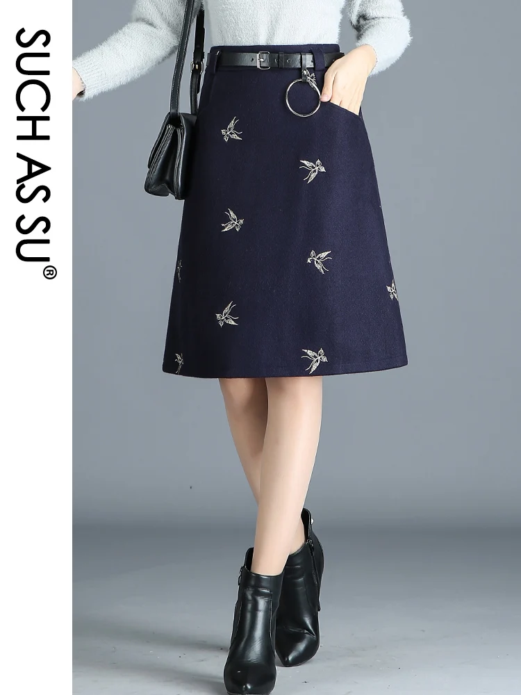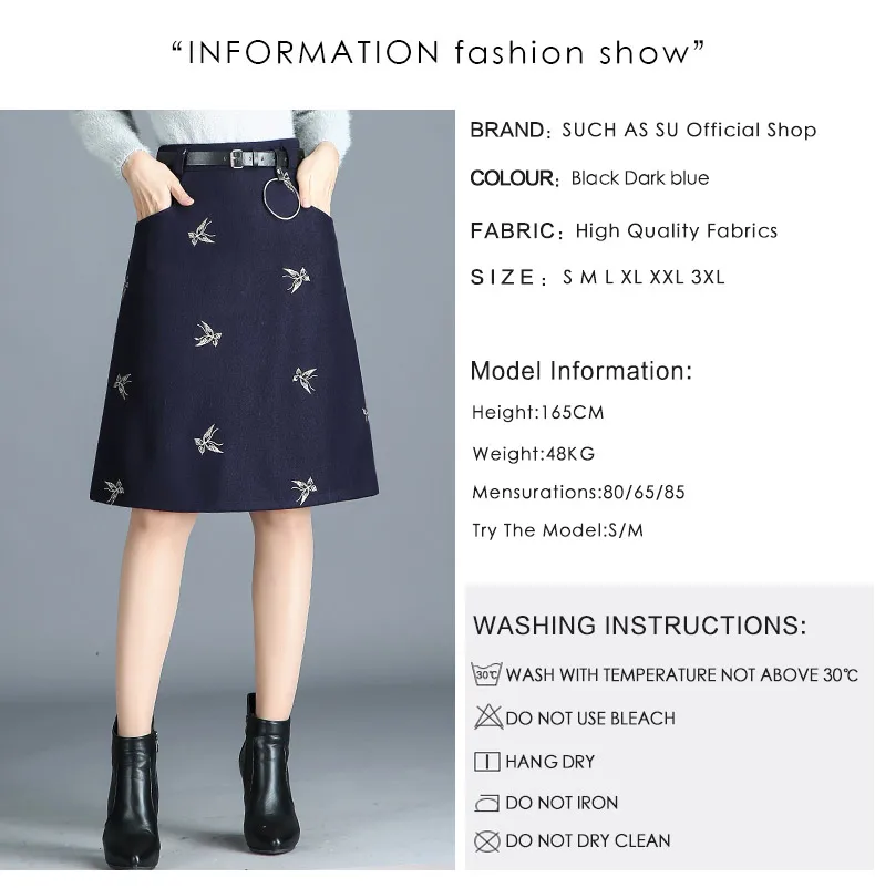 Таких как Су Новая мода 2021 осенне-зимняя одежда из шерсти юбки женские сапоги черного и темно-синего цвета с вышивкой в виде бабочек и S-3XL, с высокой талией, а-силуэт, юбка