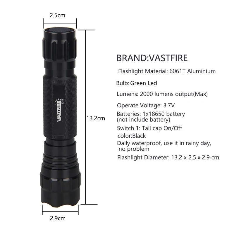Материал фонарика: алюминий 6061TПрочная закругленная рамка для усиления самообороныЛампа: красный светодиод Q5/зеленый светодиод Q5/светодиод T6Люмен: выход 5000 люмен (макс.)Рабочее напряжение: 8,4 вБатареи: 1x аккумулятор 18650Переключатель 1: включение/выключение задней крышкиПереключатель 2: дистанционный переключатель давленияЕжедневная водонепроницаемость, используйте в дождливый день, без проблемДиаметр фонарика: 13,2x2,9x2,9 смМатериал крепления: алюминиевый сплавПодходит для 25 мм фонарика и лазерного прицелаКрепление для фонарика также можно установить на стандартную рейку weaverПолностью регулируется с помощью гаек и винтов в комплектеПолное решение для установки фонарика и лазерного прицела на винтовкуУдарная способность