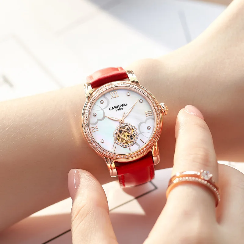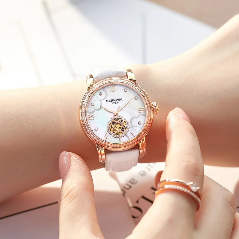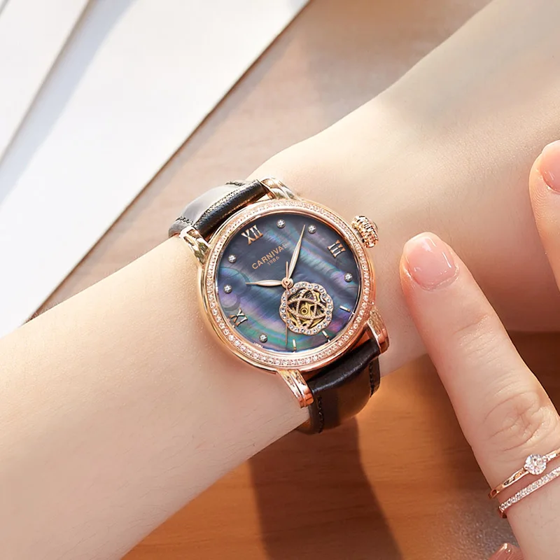 Новинка 2017, карнавальный скелет, механические часы с розовым и золотистым циферблатом, автоматические наручные часы для женщин с черным кожаным ремешком