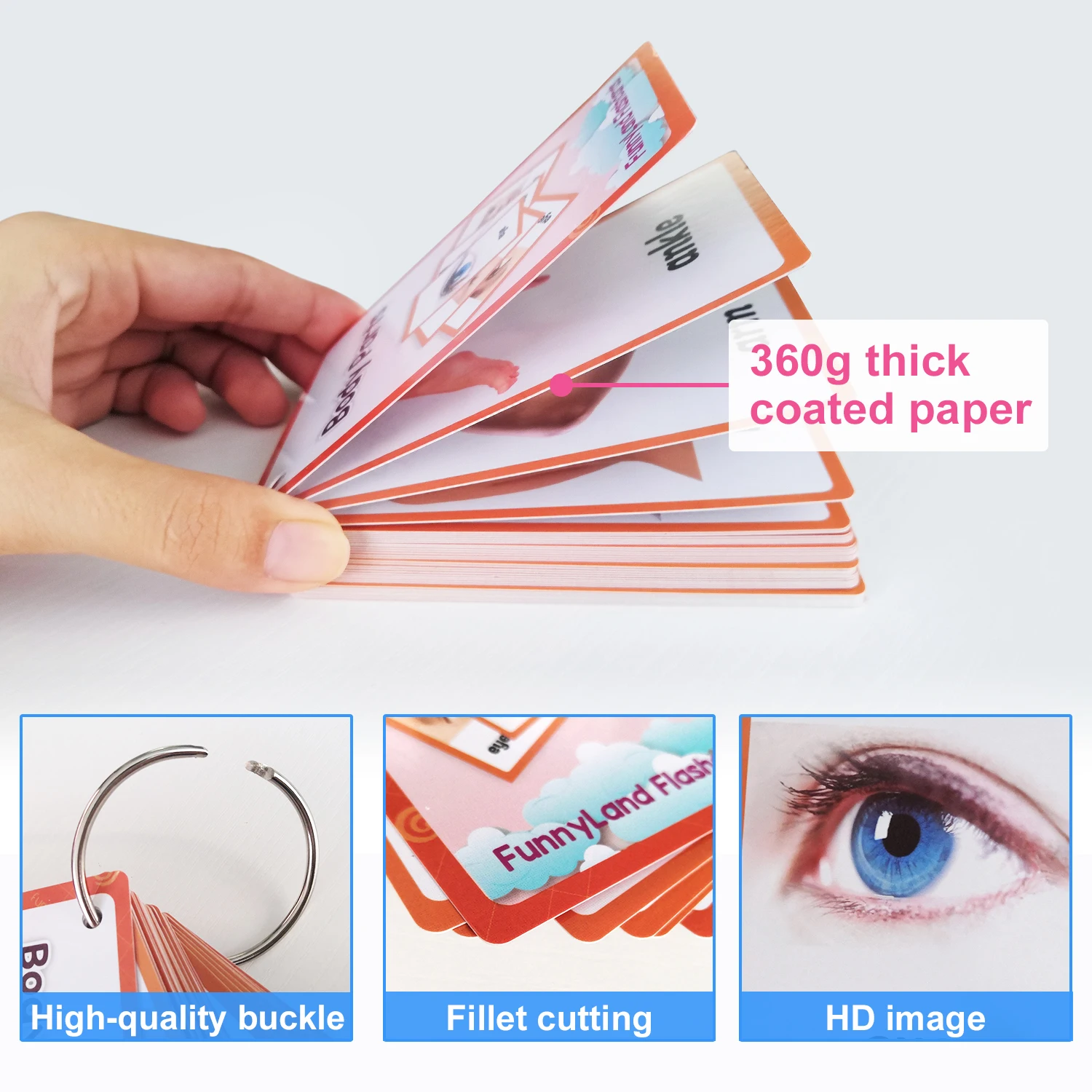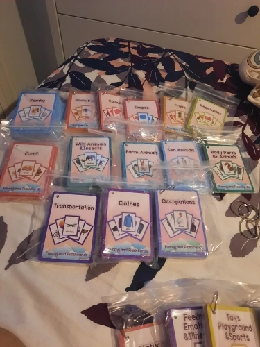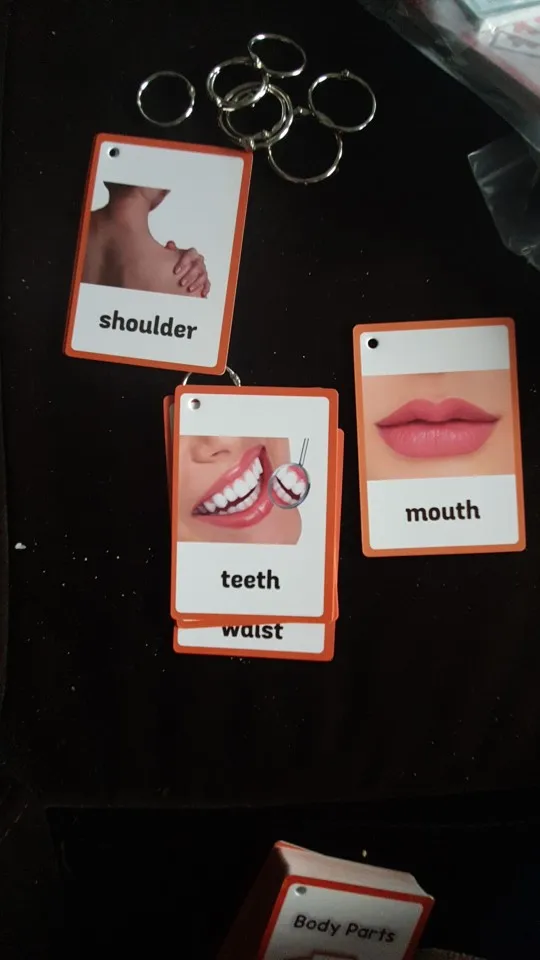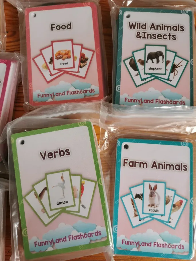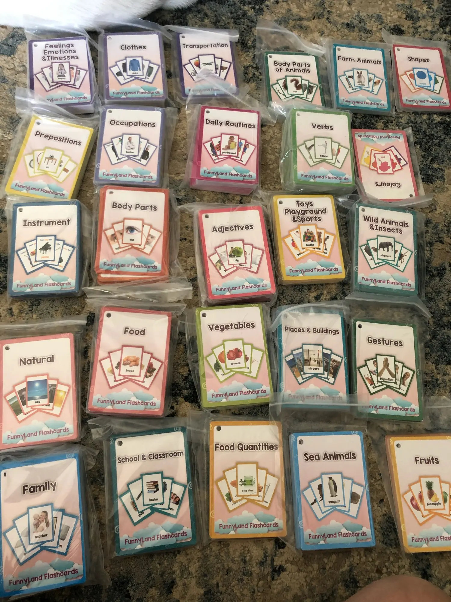Флэш-карты отличные. Каждая категория находится в вашей упаковке и с прикрепленным кольцом. Нет повреждений, карты идеальны. Они сделаны из пластикового картона, не слишком жесткие. Если они не используются тщательно, они могут быть согнуты или повреждены. Изображения очень хорошие. На лицевой стороне карты изображено изображение и слово в minuscule, сзади идет транзакция слова, qr-код, чтобы слушать его и фраза с этим словом. Посылка прибыла быстро в течение 12 дней.