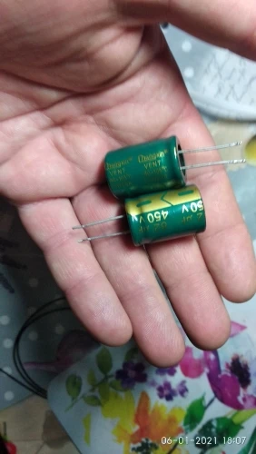 Конденсаторы хорошие, размером 18х26 мм, с выводами 1,0х20(25) мм. Ёмкость немного ниже номинала, 73 и 77 мкФ, но в пределах заявленного допуска, вес 9 гр.. Отправка удалась со второй попытки, но за полтора месяца заказ был исполнен. Спасибо!