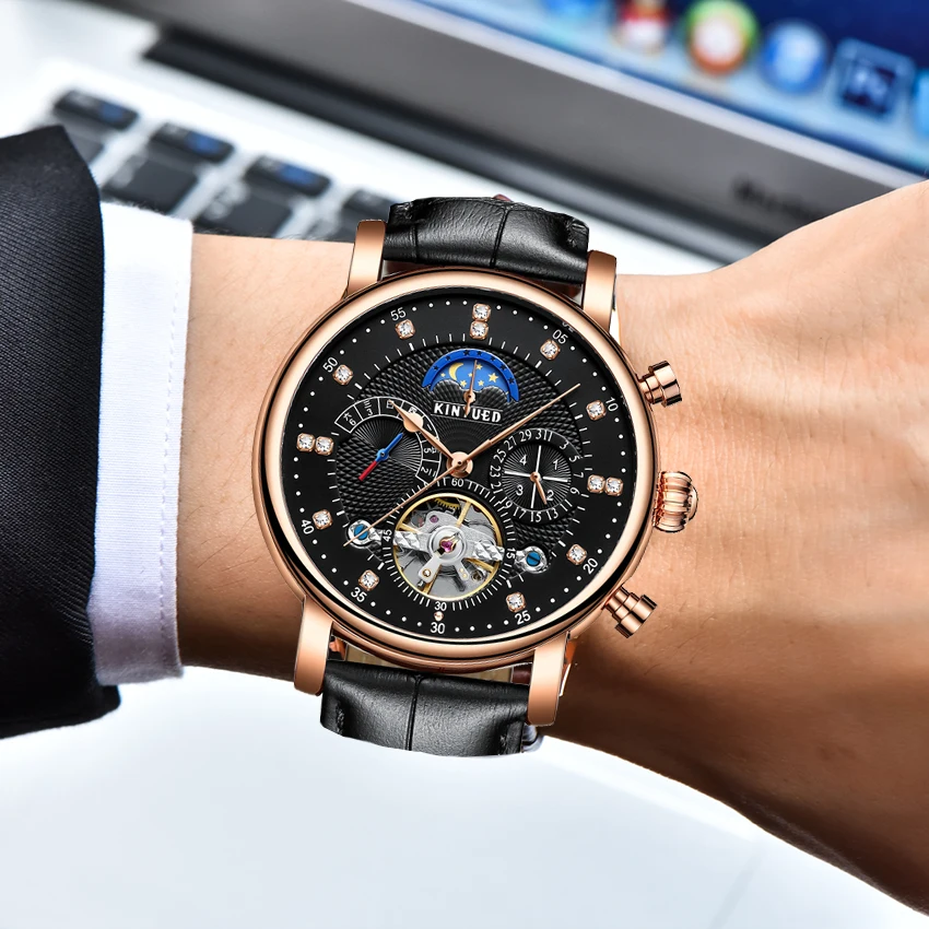 Механические часы-скелетоны KINYUED 2020 с турбийоном, мужские, из натуральной кожи, многофункциональные, автоматические