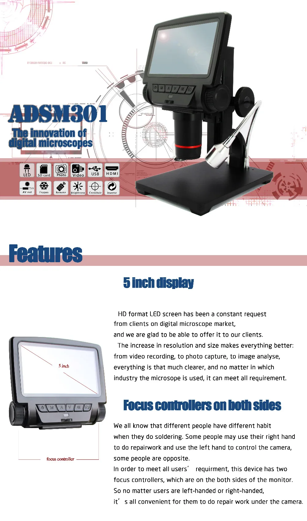 Заказал две модели ADSM 301 и ADSM302. Заказ доставили в Москву на 3-й день службой IML. Все хорошо упаковано и в сохранности. Модели сильно отличаются по конструкции. В 302 больше глубина хода объектива. Можно положить для просмотра высокую плату. В 302 более длинный объектив, более плавная настройка резкости. Но подсветка только от двух боковых светильников. Кронштейны у обеих моделей не отклоняемые. У 302 поворотный экран в горизонтальной плоскости на 90 градусов. Резкость наводится хорошо. Мозги, похоже, у обеих моделей одинаковые. Изображение на экране микроскопов хорошее с правильной цветопередачей. Впрочем, картинка на экране 4К телевизора совсем не впечатлила. Слишком много лишних деталей. Для меня будет достаточно экрана микроскопа. В 301 лучше и удобней подсветка с плавной регулировкой в объективе. В остальном модели одинаковы. Сделаны качественно. Рекомендую и товар и продавца.