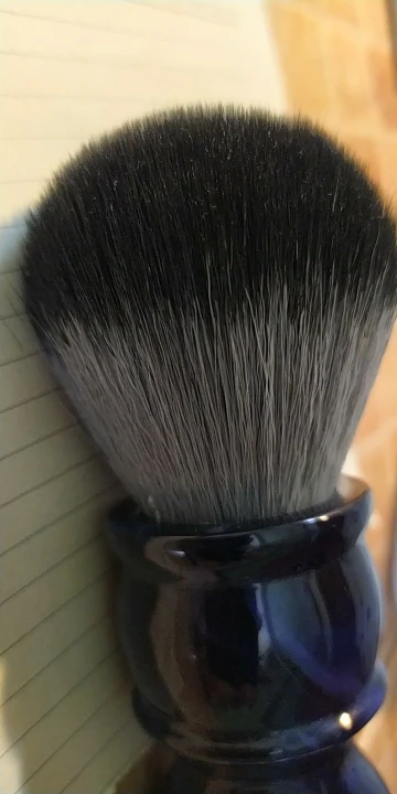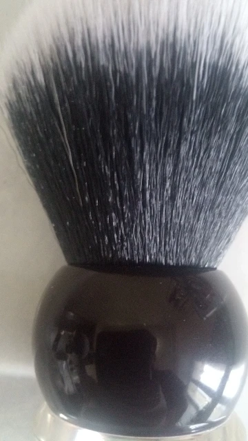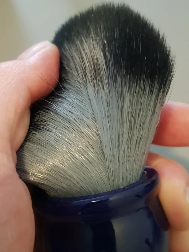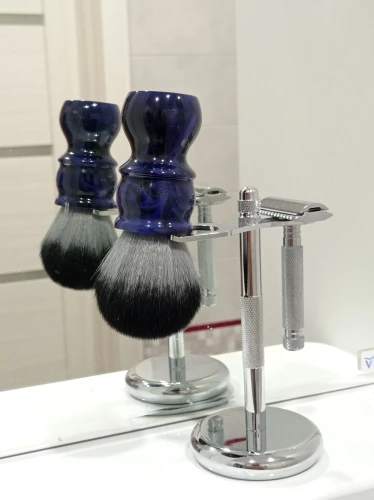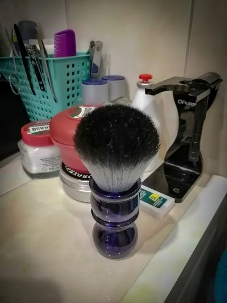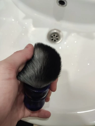 Помазок обалденно мягкий!!! по сравнению с кабоном, потом барсуком, синтетика мне очень зашла. Размер большой, в руке сидит комфортно, хомячит пену, после взбивания пены, количество ее в помазке хватает на все бритье, 3-4 прохода и еще подмащать, там где не добрил. В первые 2-3 бритья вылезли несколько волосков, я уже думал, что брак и облысеет, но потом облазить перестал. Рукоятка широковата и в мою родставку не влез, поэтому стоит вертикально пока, для синтетики это не страшно