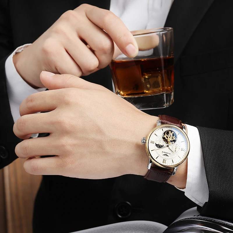 Часы наручные Guanqin Мужские автоматические, брендовые Роскошные водонепроницаемые светящиеся механические с кожаным ремешком, с турбийоном, с Лунной фазой