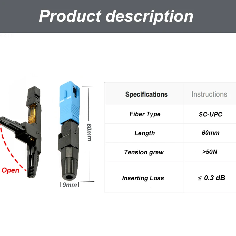Особенности:Новый уникальный дизайн, установка без впрыска клея, без шлифовки,Встроенная структура; Простота в эксплуатацииНизкие вносимые потери, высокие Возвратные потери