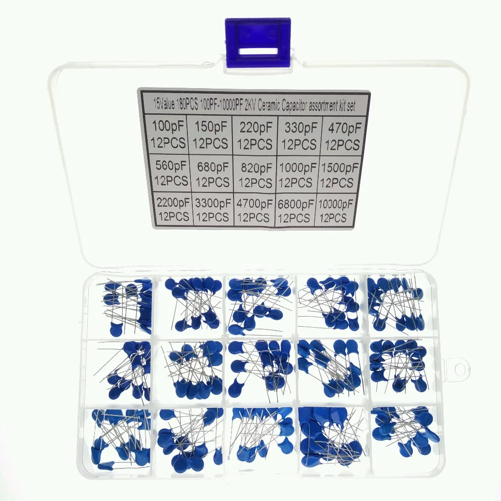 15 значений 180 шт. 100pF 10000pF 150pF 220pF 330pF 470pF 560pF 680pF 820pF 1000pF 1500pF 2KV керамический набор различных конденсаторов