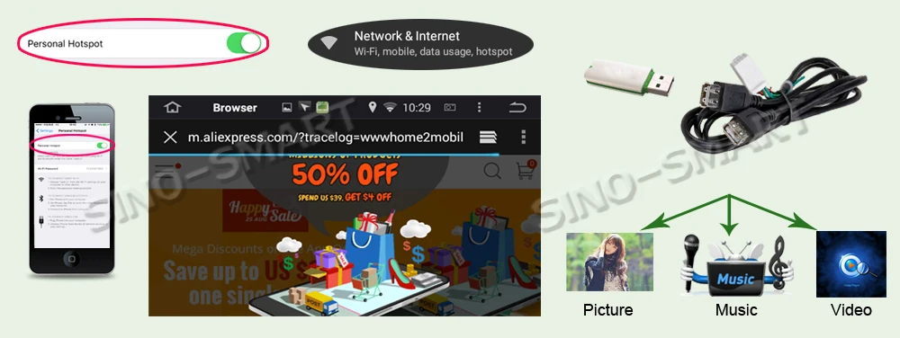 6. Встроенный WIFI (посетите Интернет через телефон hotpot)7. Музыка и видеоплеер (воспроизведение музыки или видео онлайн, с usb-диска или встроенной памяти)