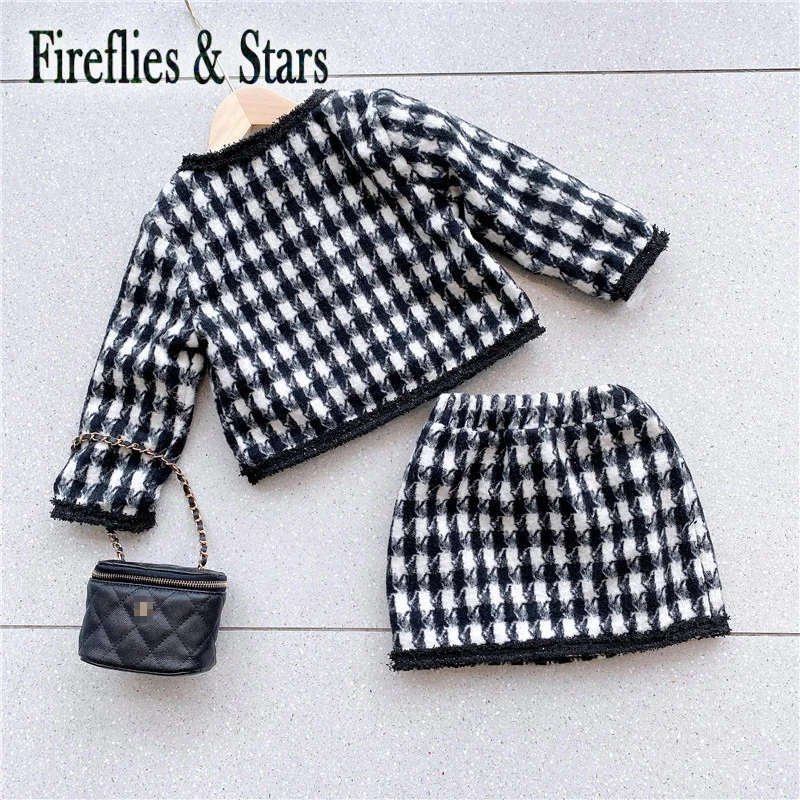 Демисезонный комплект из 2 предметов для девочек, Детское пальто + мини-юбка, Детский костюм, брендовая одежда, клетчатая сетчатая ткань на пуговицах от 3 до 8 лет