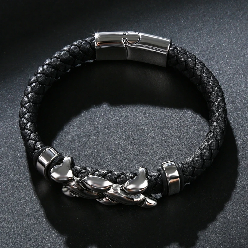 Изысканный плетеный кожаный браслет с защелками из нержавеющей стал...
