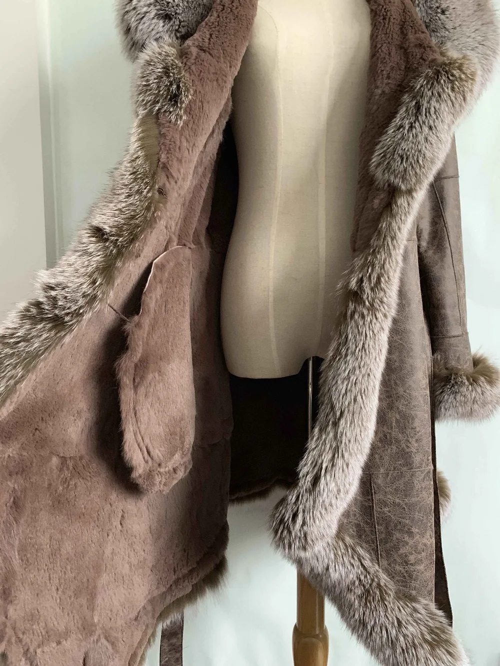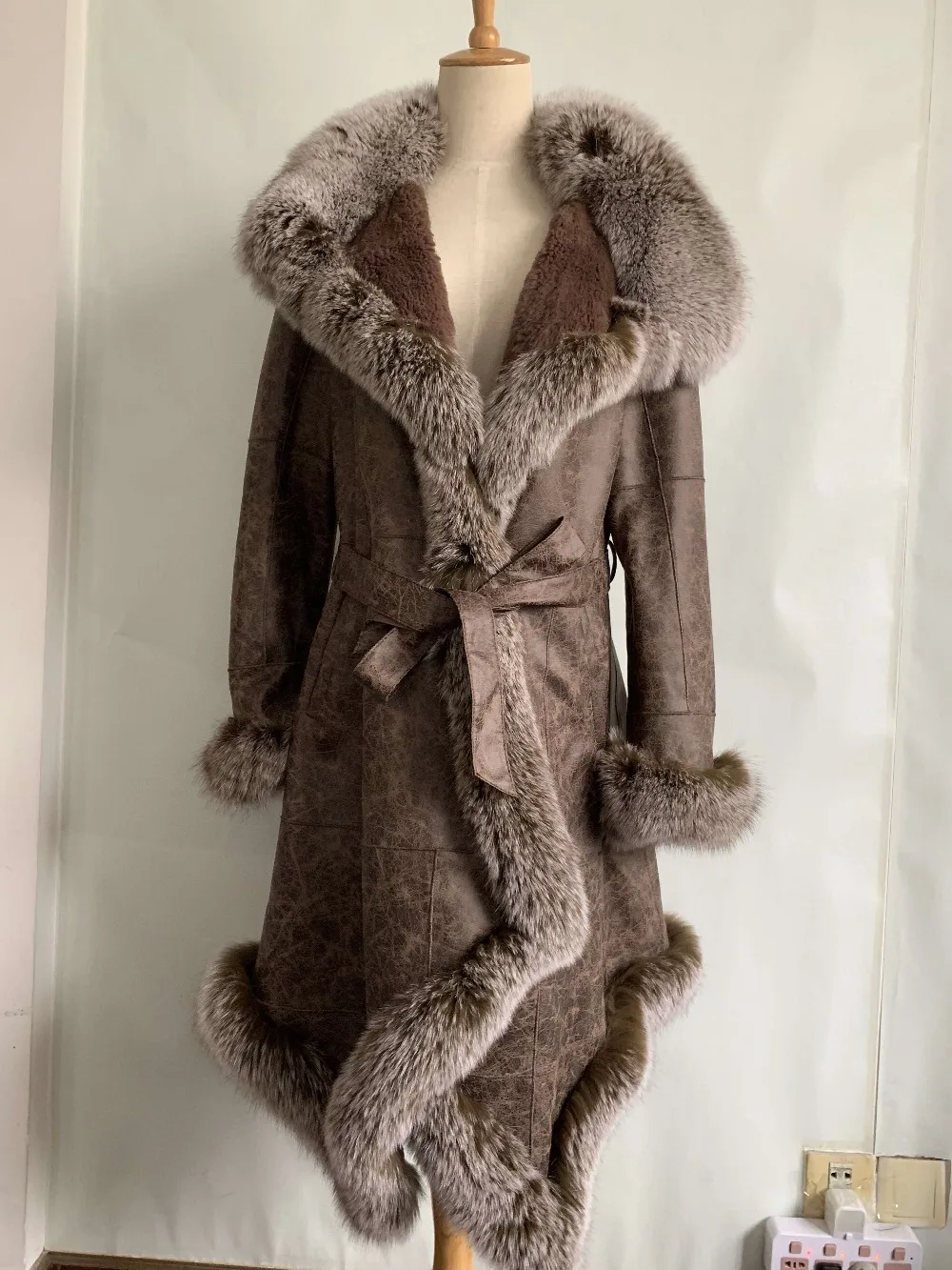 Лидер продаж, Женская замшевая Слитная куртка на сезон осень-зима с мехом, теплая Роскошная верхняя одежда из натурального Лисьего меха с длинным рукавом