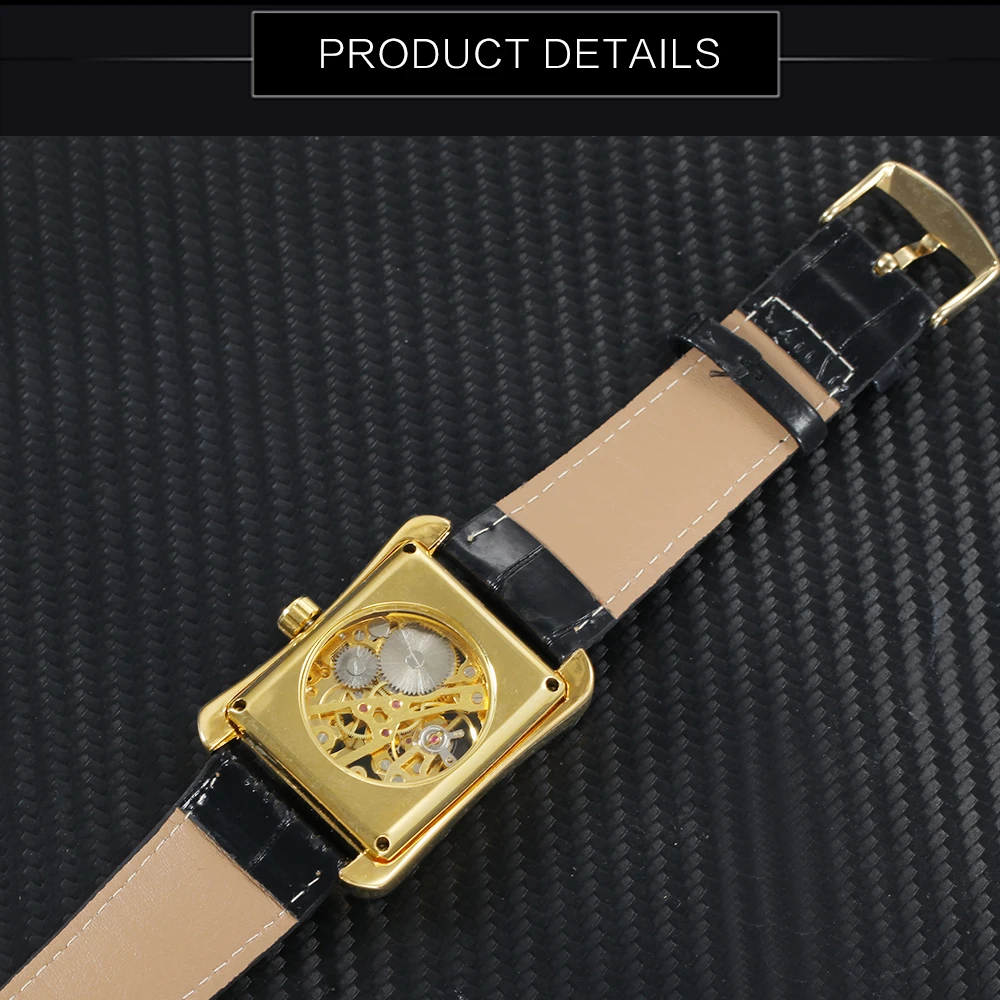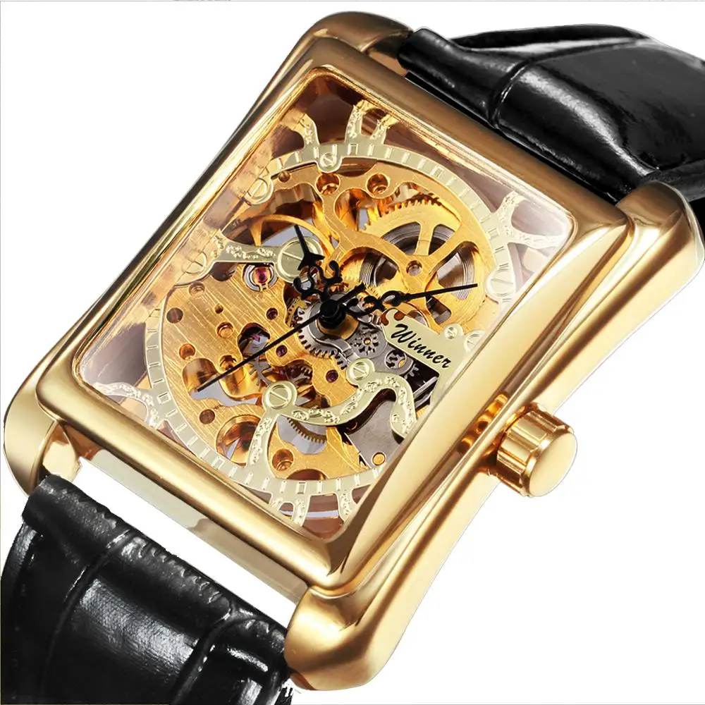 Часы-скелетоны WINNER Мужские механические, брендовые роскошные классические прямоугольные в стиле ретро, с кожаным ремешком, с золотым и прямоугольным ремешком, элегантные