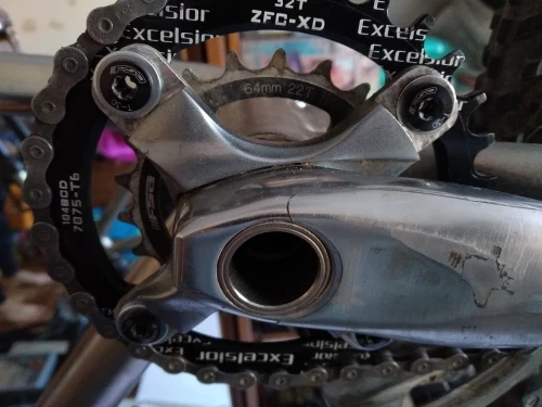 Кассета встала четко без люфта на втулку shimano. Без расширителя на последние две звезды переключатель старого образца не может закинуть цепь. С расширителем всё переключается нормально. Для установки одной передней звёзды нужны новые бонки. Я использовал старые с шайбой. Передний переключатель и маленькую звёздочку ещё не снял, буду снимать позже.