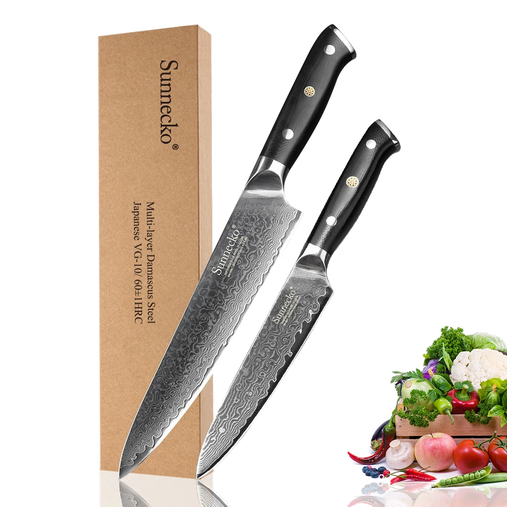Набор кухонных ножей из дамасской стали SUNNECKO 2 шт., Универсальный японский резец шеф-повара VG10 Core G10, острый нож для резки фруктов и мяса