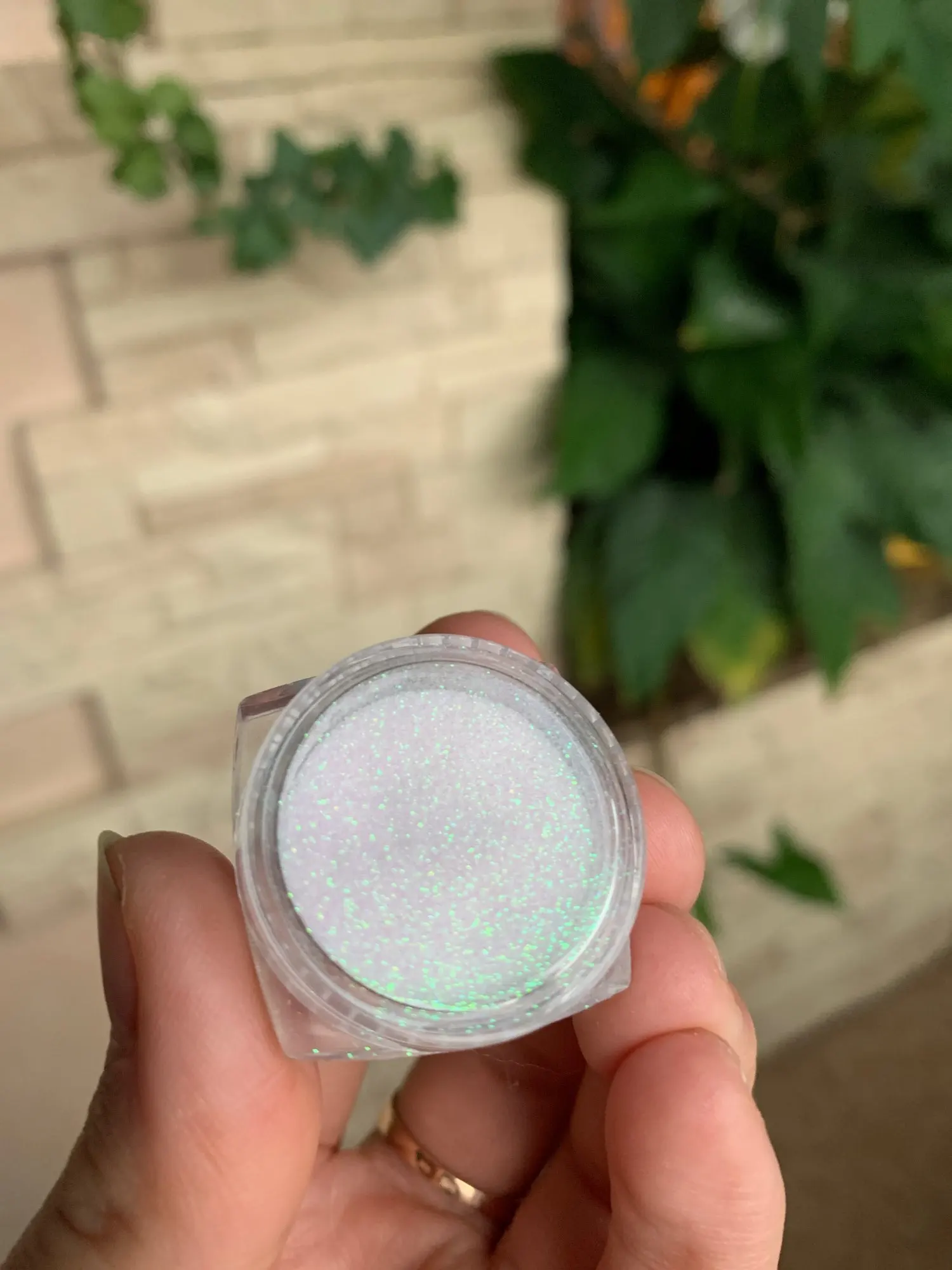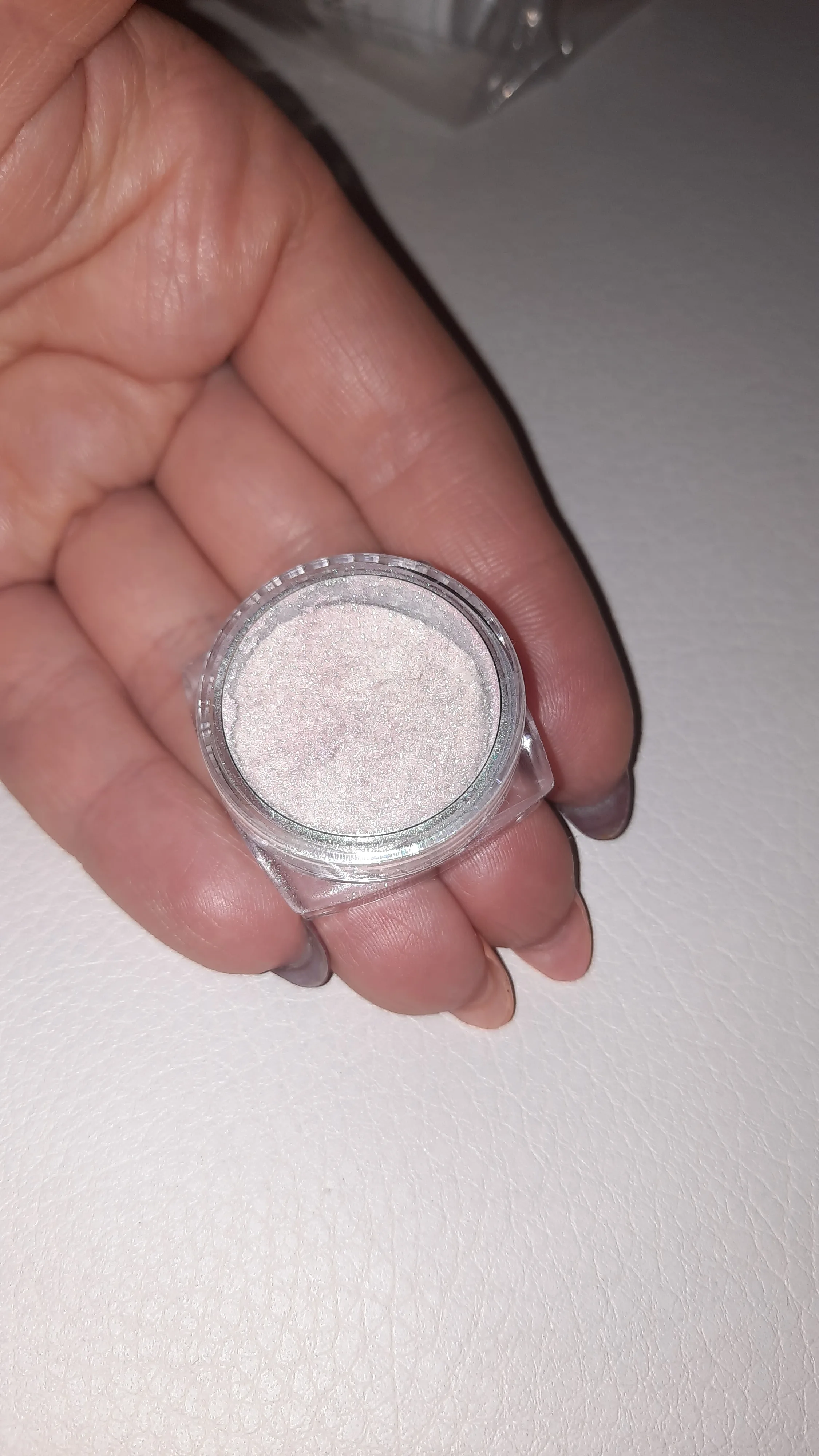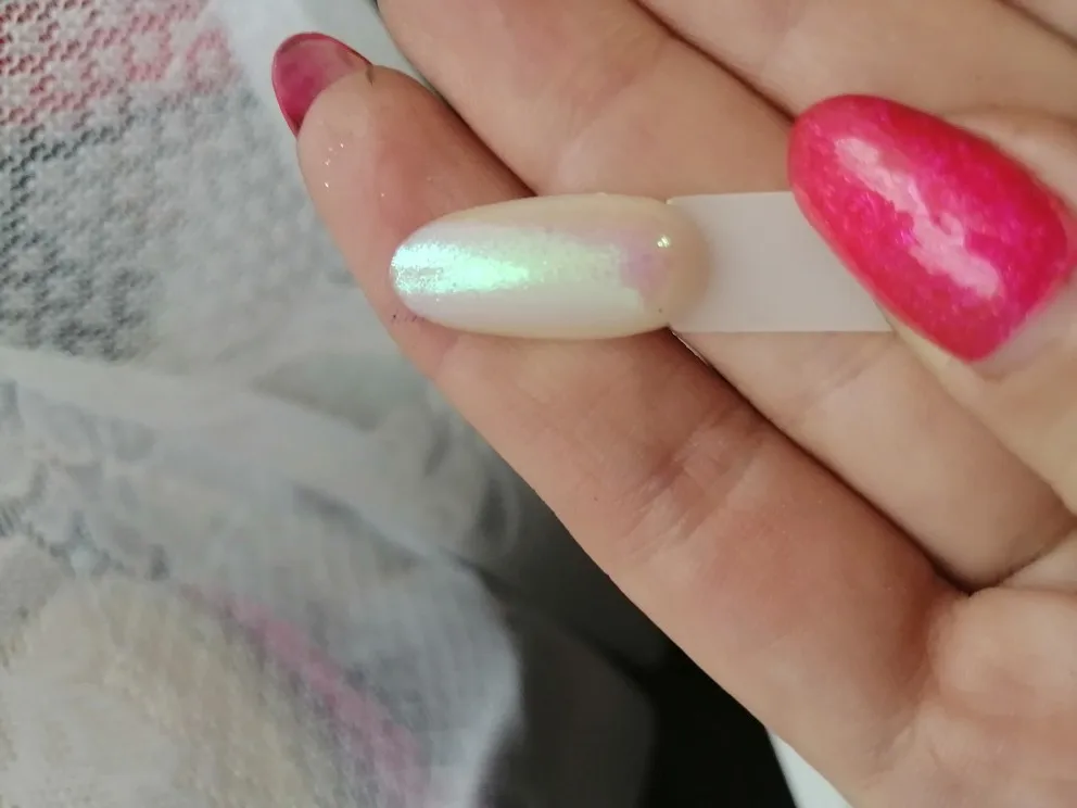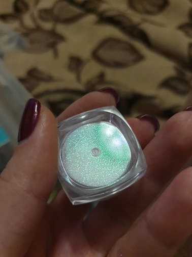 Пришла посылка за обычное время, шла больше месяца, наполнение баночки хорошее, описание конечно обнять и плакать, втиркой единорог не пахнет вообще, если захотите брать такую втиркой как я, то это не в Ирка, а посыпушка белого цвета с блёстками, которые отдают зелёным оттенком и втирается только на липкий слой, ориентироваться надо на второе фото у продавца, где именно ноготь сфоткан, а так, сама виновата лучше читать надо и смотреть , моя камера не передаёт, но частицы крупные и хорошо заметные.