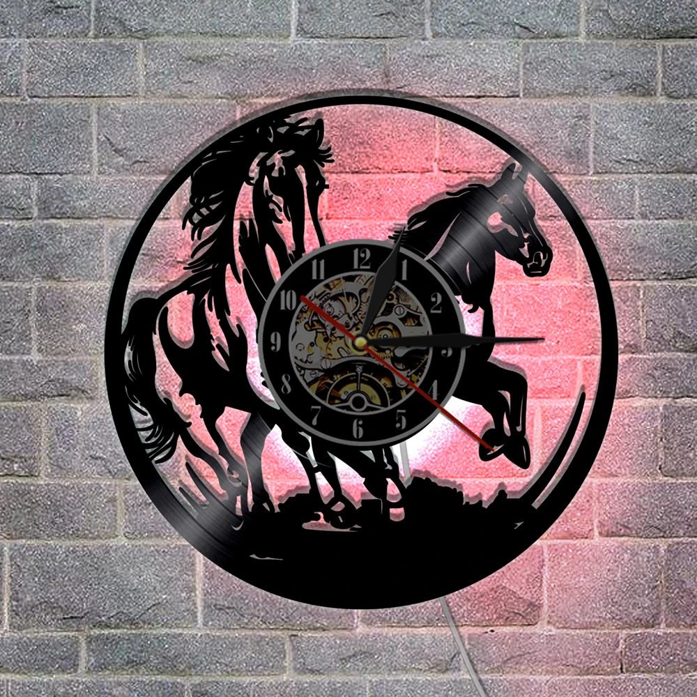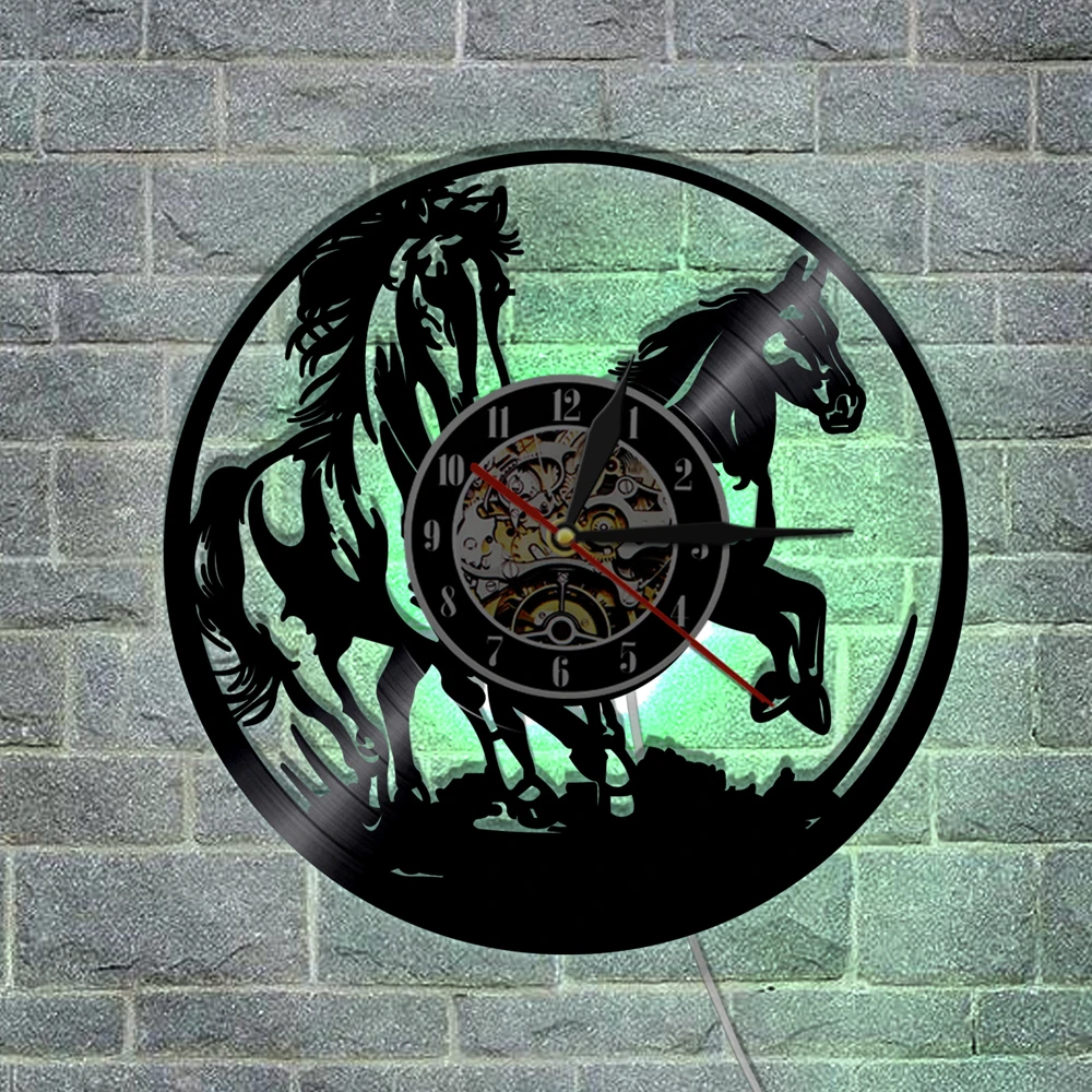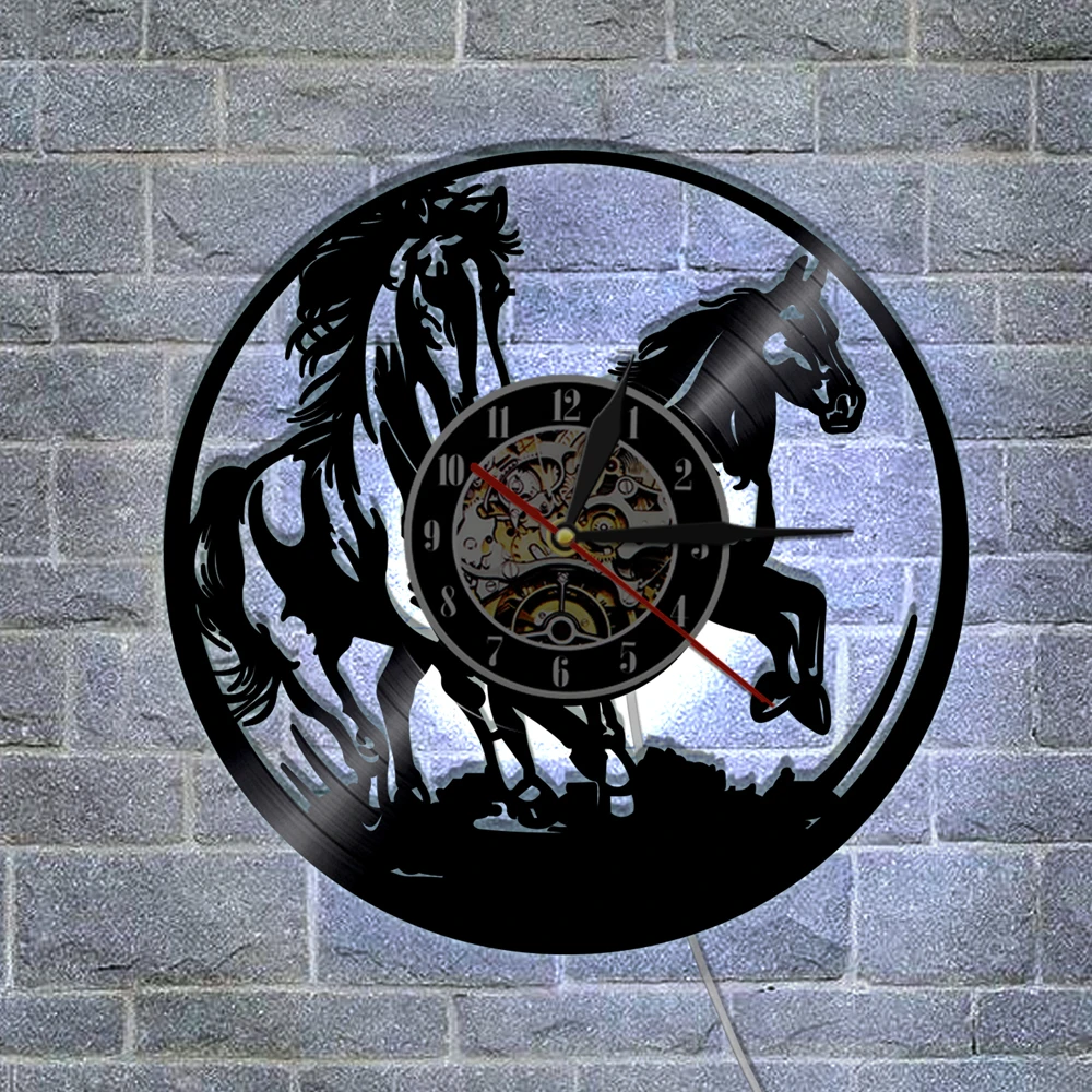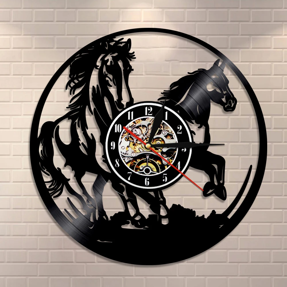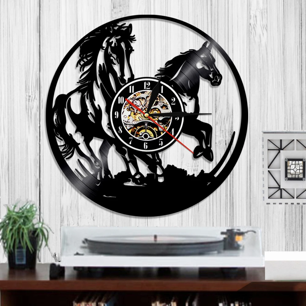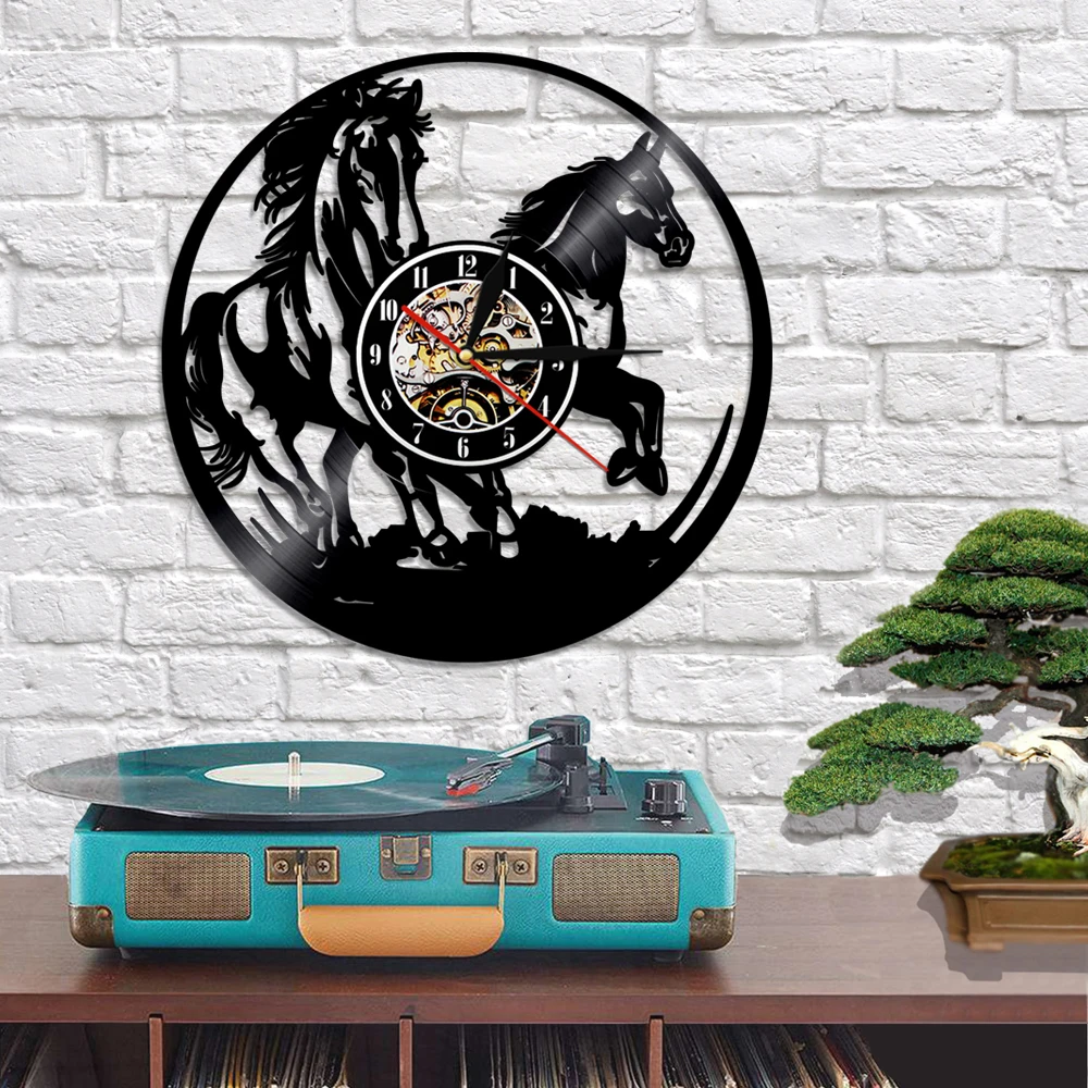 Настенные часы бегущие лошади с виниловой пластиной, силуэт лошади, лазерная гравировка, альбом, музыкальная запись, настенные часы, часы для украшения дома