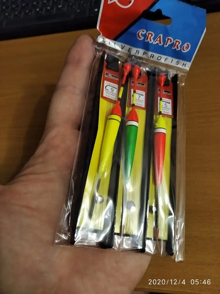 Такое впечатление,что товар покупал в детском мире!Эти поплавки подойдут разве,что для ловли в аквариуме))).Если на шестиметровой удочке их закинешь,то не сразу найдёшь)).Крючки вообще смех,как будто размеры наши и китайские не совпадают.К продавцу претензий нет,он отправил сразу. Доставка до Москвы месяц.