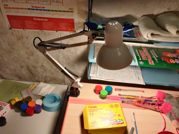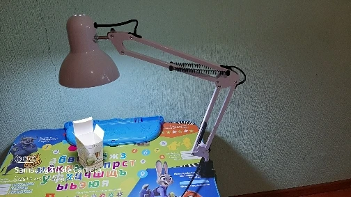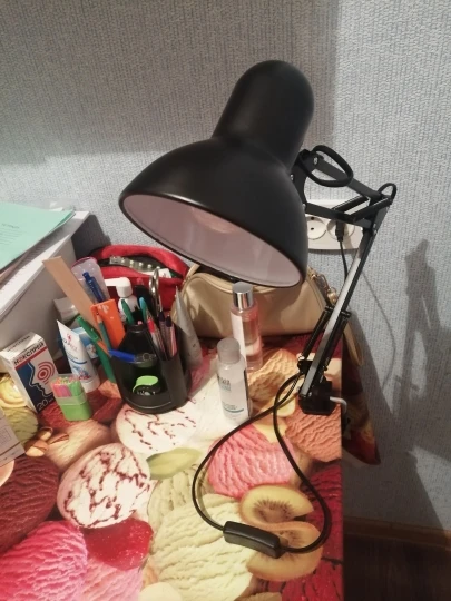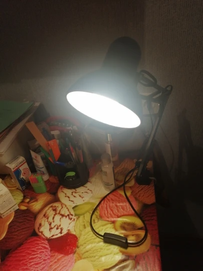 достаточно компактная лампа. все в точности как на картинке. работает хорошо. крепеж стандартный, фиксация положений лампы хорошая. как источник света для парты ребенка или света за компьютерным столом - то, что надо