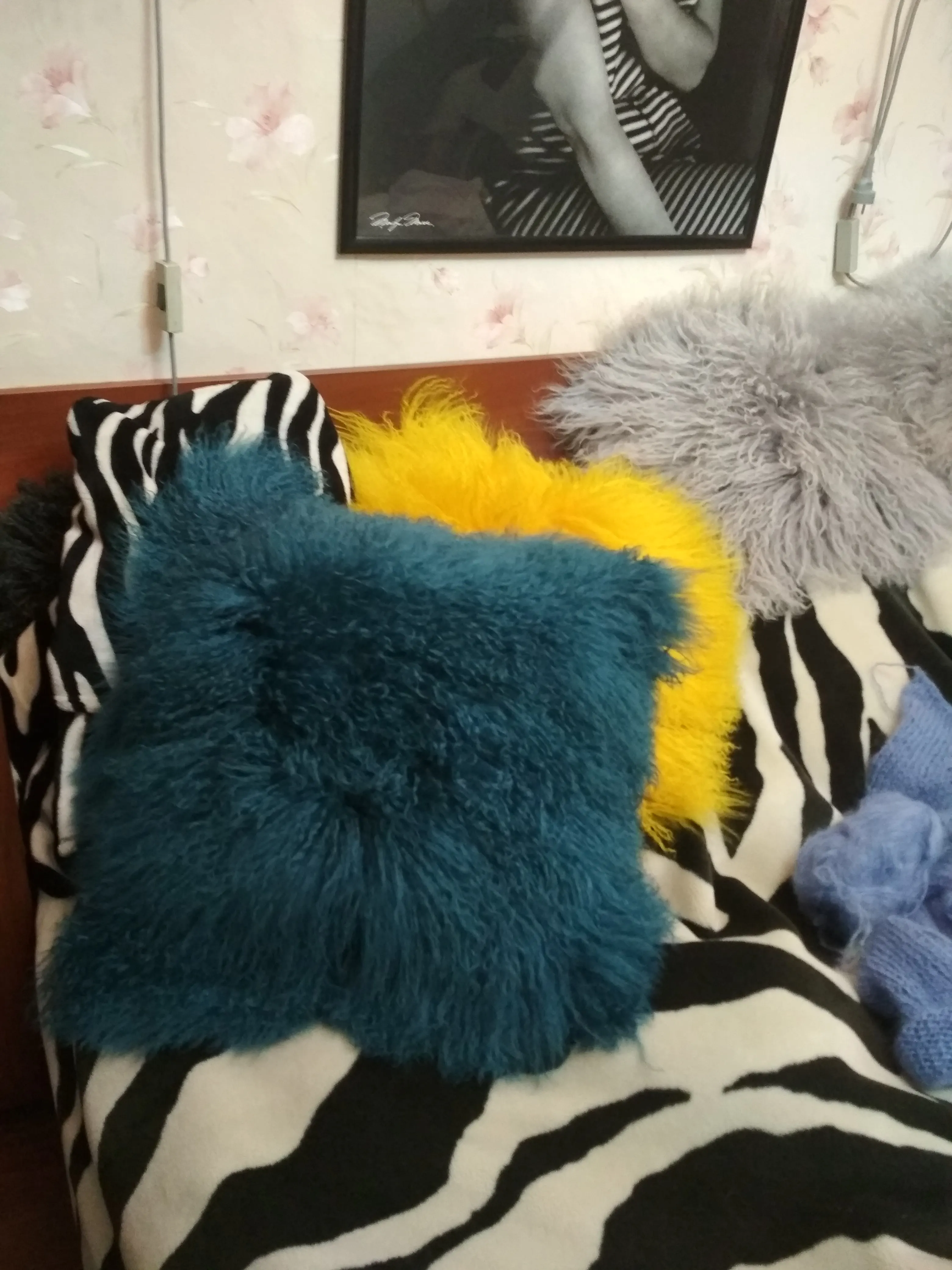 Наволочка очень хорошего качества, шерсть длинная, пушистая, без запаха. Но цвет не соответствует картинке. На картинке она ярко-голубая, а мне пришла темно-бирюзовая. Она тоже очень красиво смотрится, но я покупала под голубое кресло.