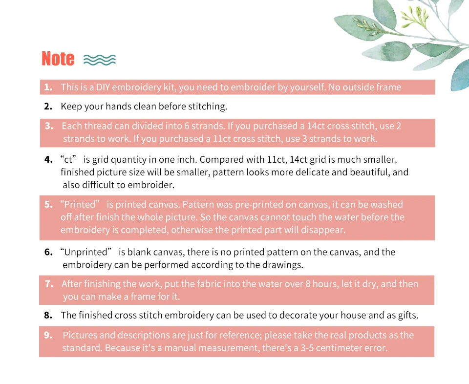 1. Это Набор для вышивания своими руками, вам нужно сделать вышивку своими руками.2. Размер, указанный на обложке посылка, относится к размеру ткани для вышивки, а не к размеру рисунка.3. Рисунок ткани напечатан на холсте (11CT и 14CT). Поэтому ткань для вышивки нельзя замачивать в воде до завершения вышивки крестиком, иначе напечатанная часть исчезнет.4. Ткань без принта, ткань для вышивки белая, на ткани для вышивания нет напечатанного рисунка, его необходимо вышивать в соответствии с рисунками.5. После шитья Замочите ткань для вышивания в теплой воде на 1 час, затем достаньте ее для сушки, а затем сделайте для нее рамку.