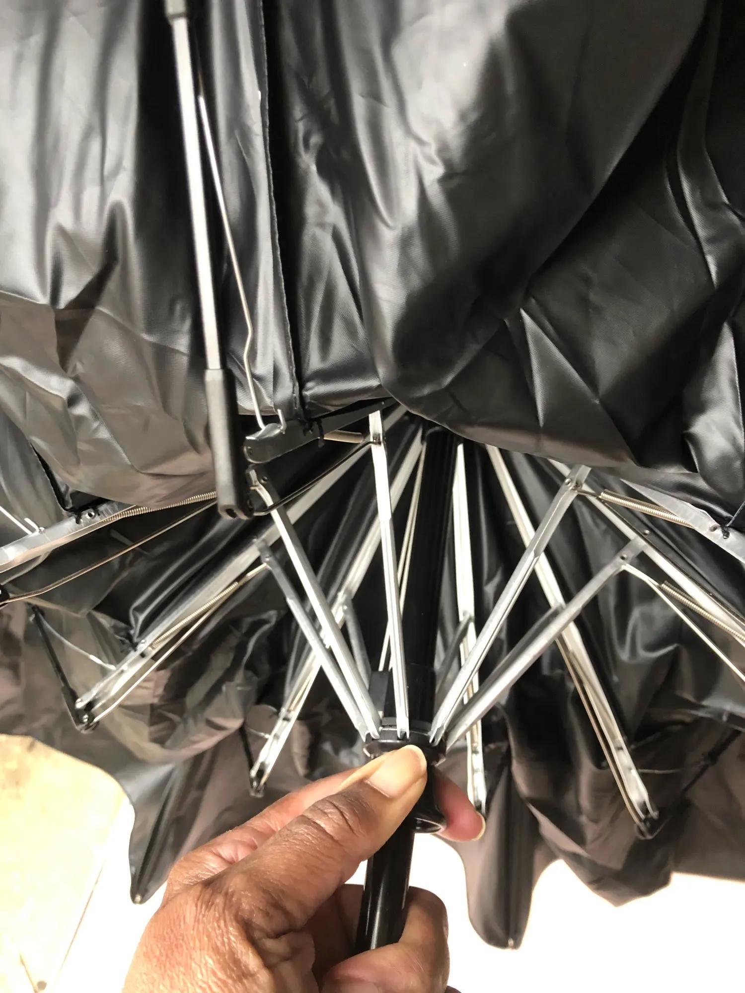 На первый взгляд качественный зонт. Довольно тяжелый. Гладкий материал. Внутри все черное. У него необычный неприятный запах. Срок доставки в ЕС составляет более одного месяца.
