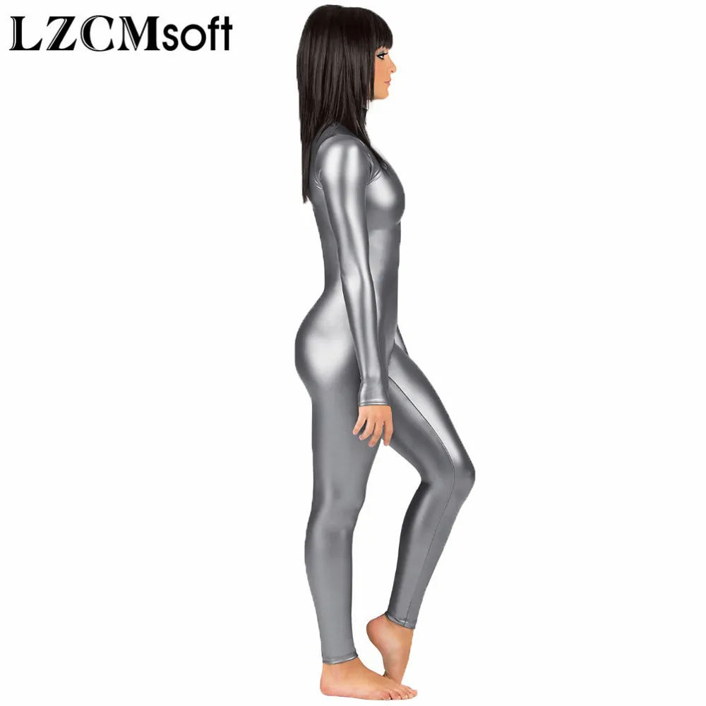 LZCMsoft для взрослых блестящий металлик черный длинный рукав комбинезон женский спандекс Полный боди комбинезон балетный танцевальный облегающий костюм