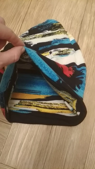 оригинальная шапка. материал хороший. сначала непонятно, как надевать, большую голову. но если поля завернуть внутрь, то все ок. оригинально смотрится и расцветка супер.