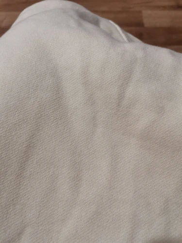 Много катышков пыли, надо наверное просто постирать. А так приятная на ощупь и к телу, цвет полностью соответствует. Поверхность не синтетическая, а из мягкого хлопка с полиэстром, боюсь, что будет цепляться и закатываться...
