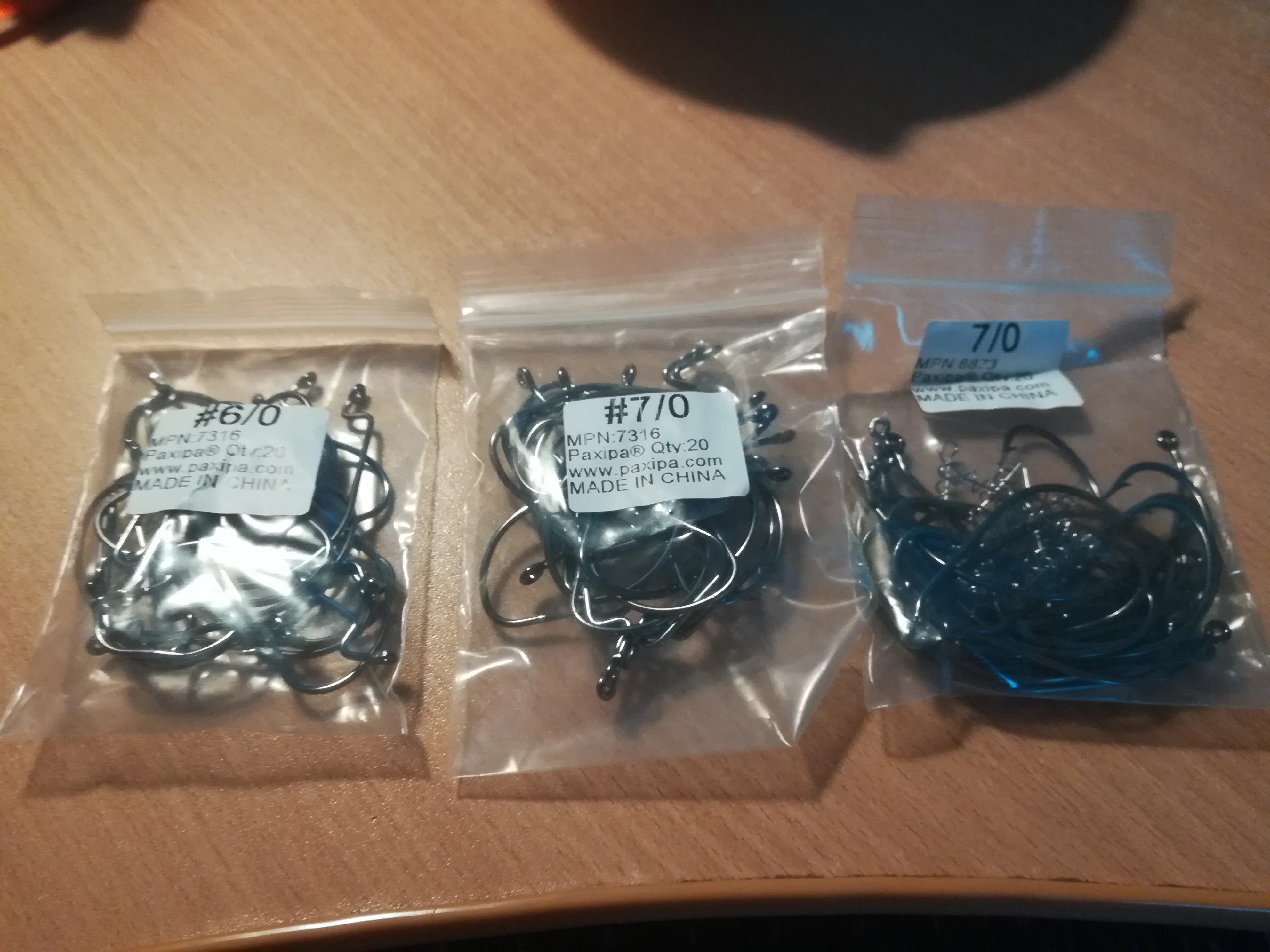 Трекер отслеживался частично, только отправление и прибытие. Дошло за 29 дней, до ДВ. Пакетики подписаны. В обоих по 20 штук. 6/0 и 7/0 почти одинаковые, разница незначительная: в весе; в размере и толщине проволоки. Какие больше понравятся - узнаем только летом.