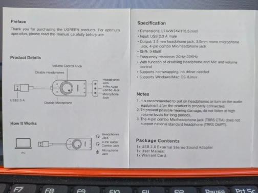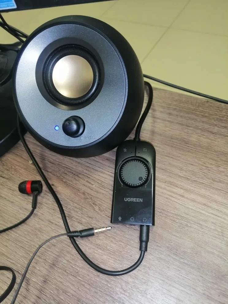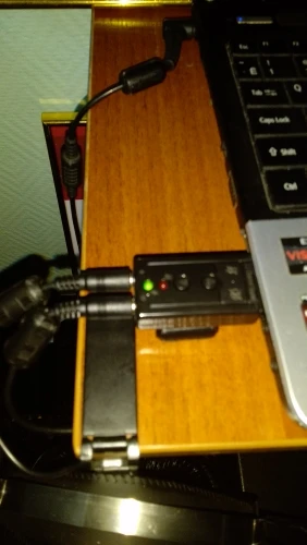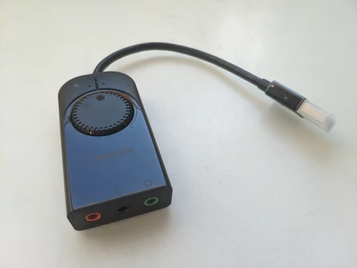 Наушники работают, звук хороший. Микрофон не проверяла ещё. У меня комп убран далеко, очень неудобно добираться до задней стенки, что бы переключать наушники/колонки, поэтому вовод черёд usb удлинитель и эту звуковушку стал для меня идеальным решением.