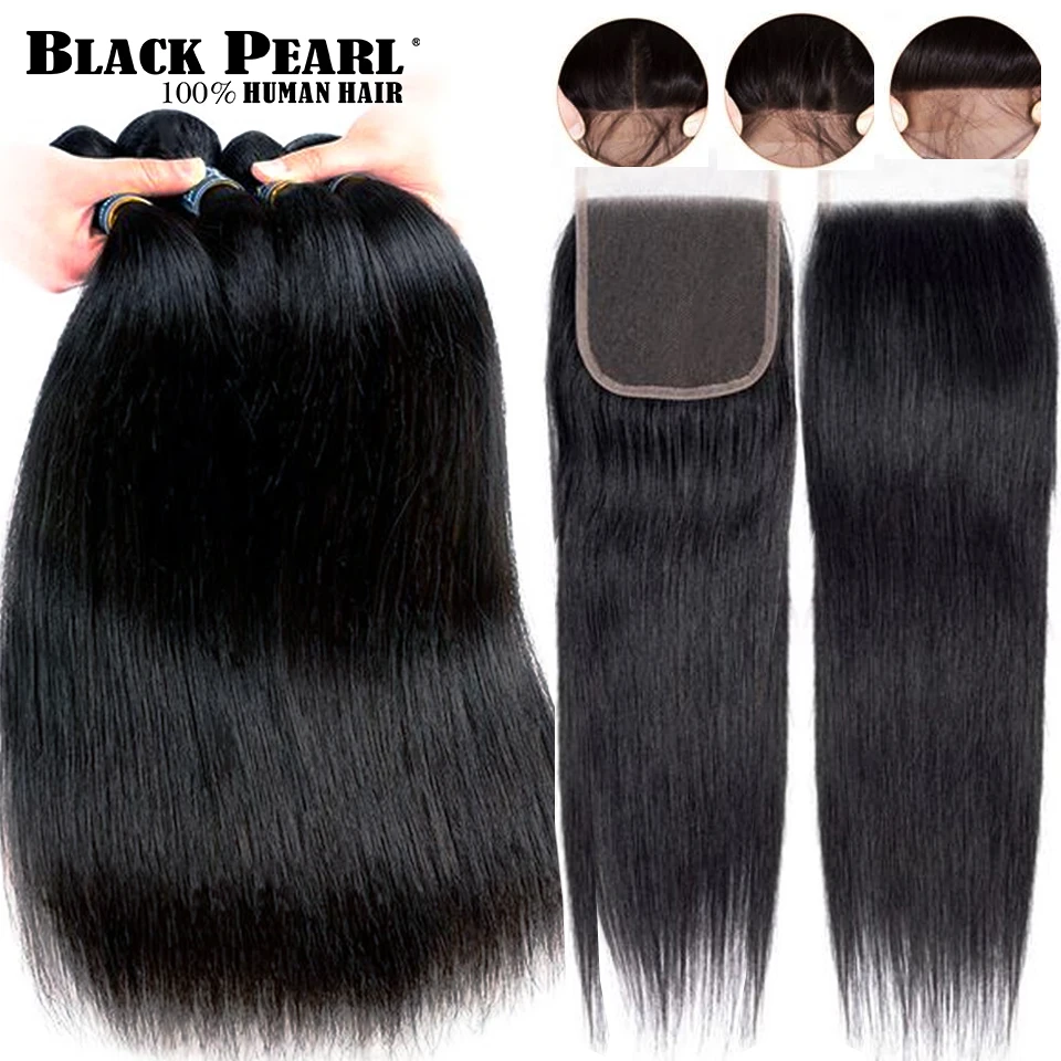 Пряпряди из черного жемчуга с закрытием, 30 дюймов, человеческие волосы 3 пряди с закрытием, перуанские пучки волос с закрытием